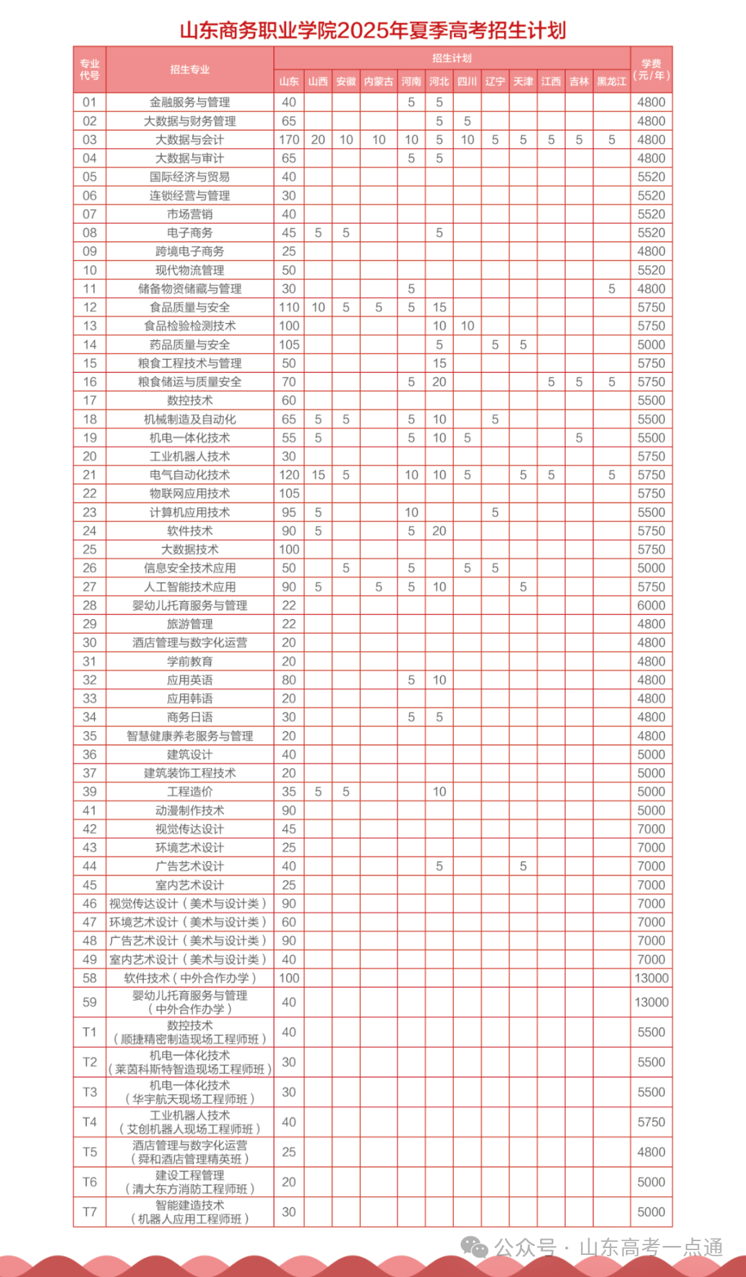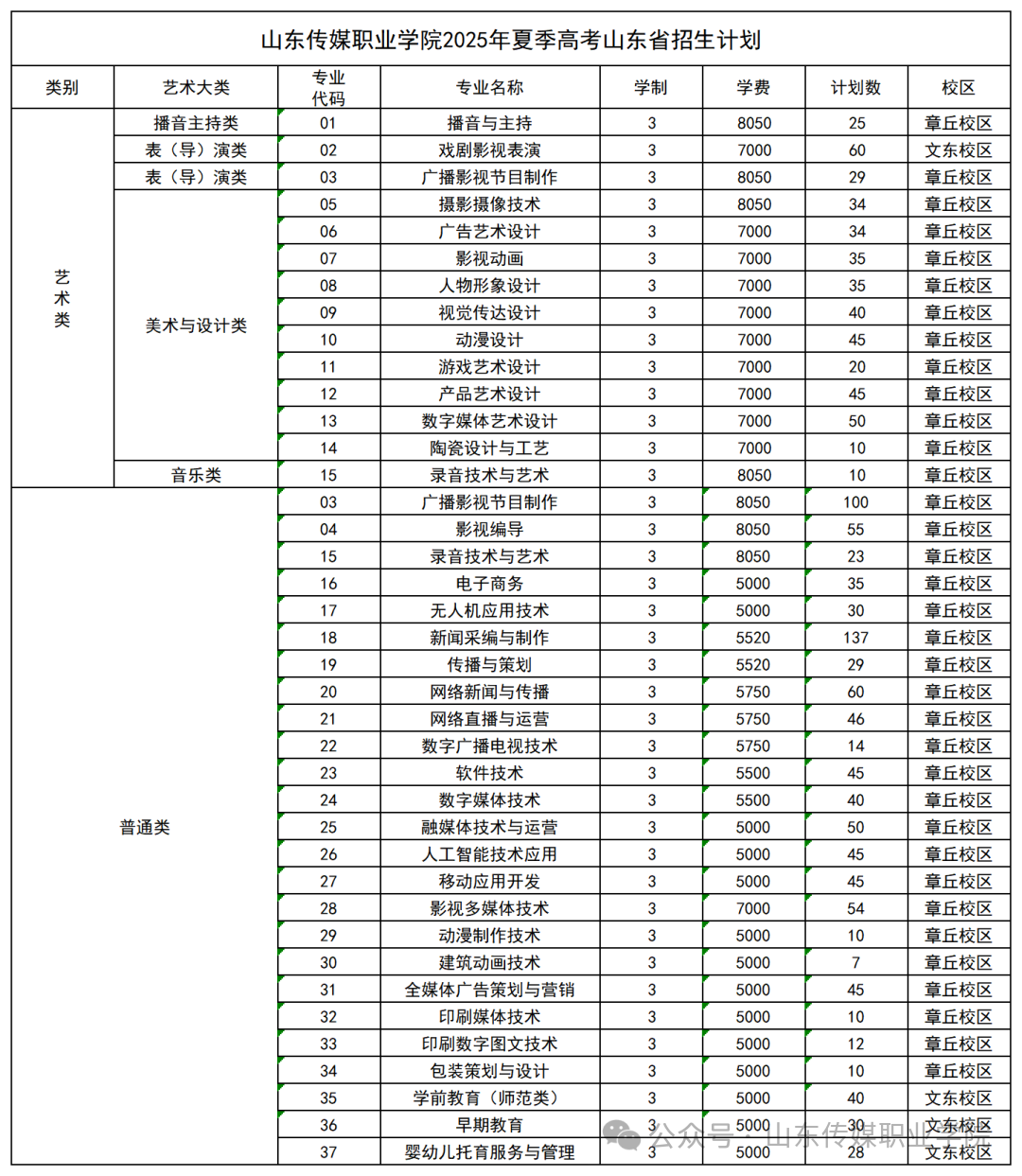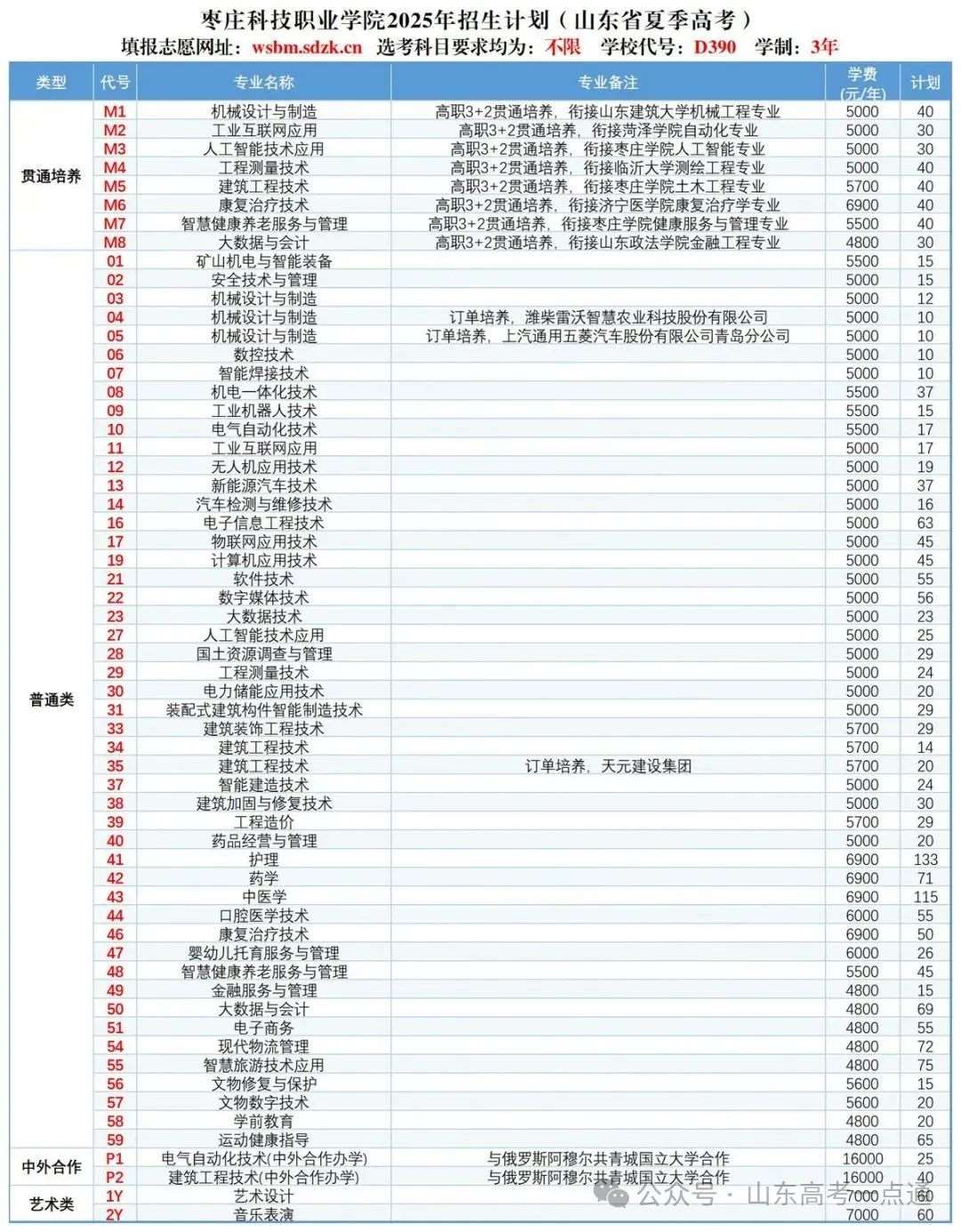学校2025年山东省普通高考分专业招生计划一览表
