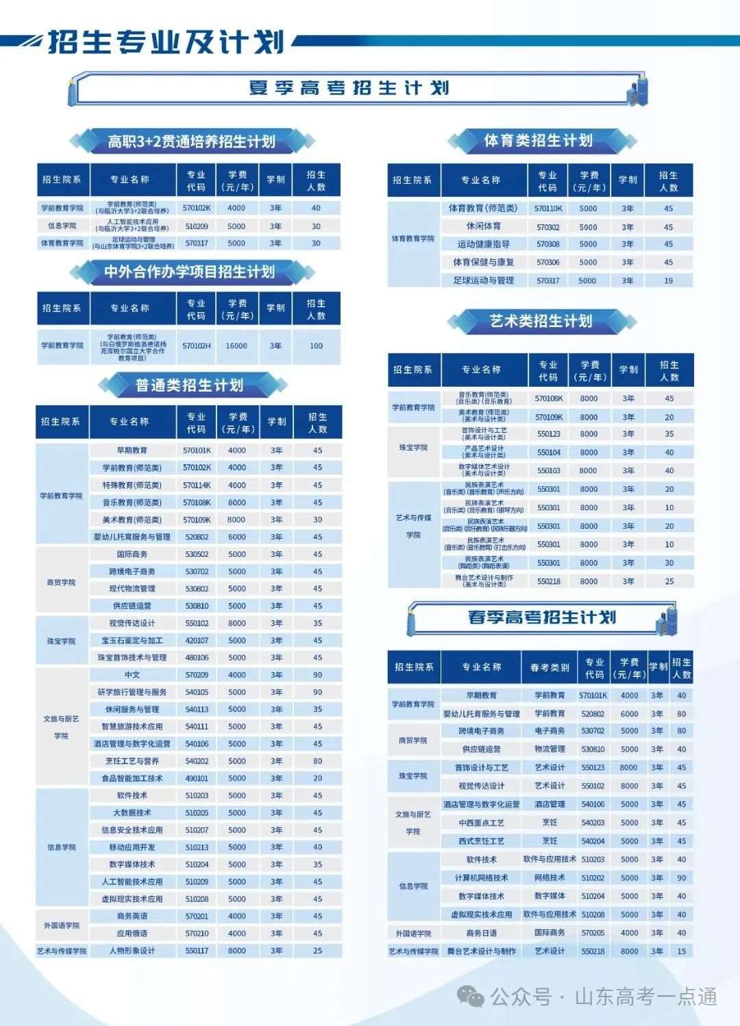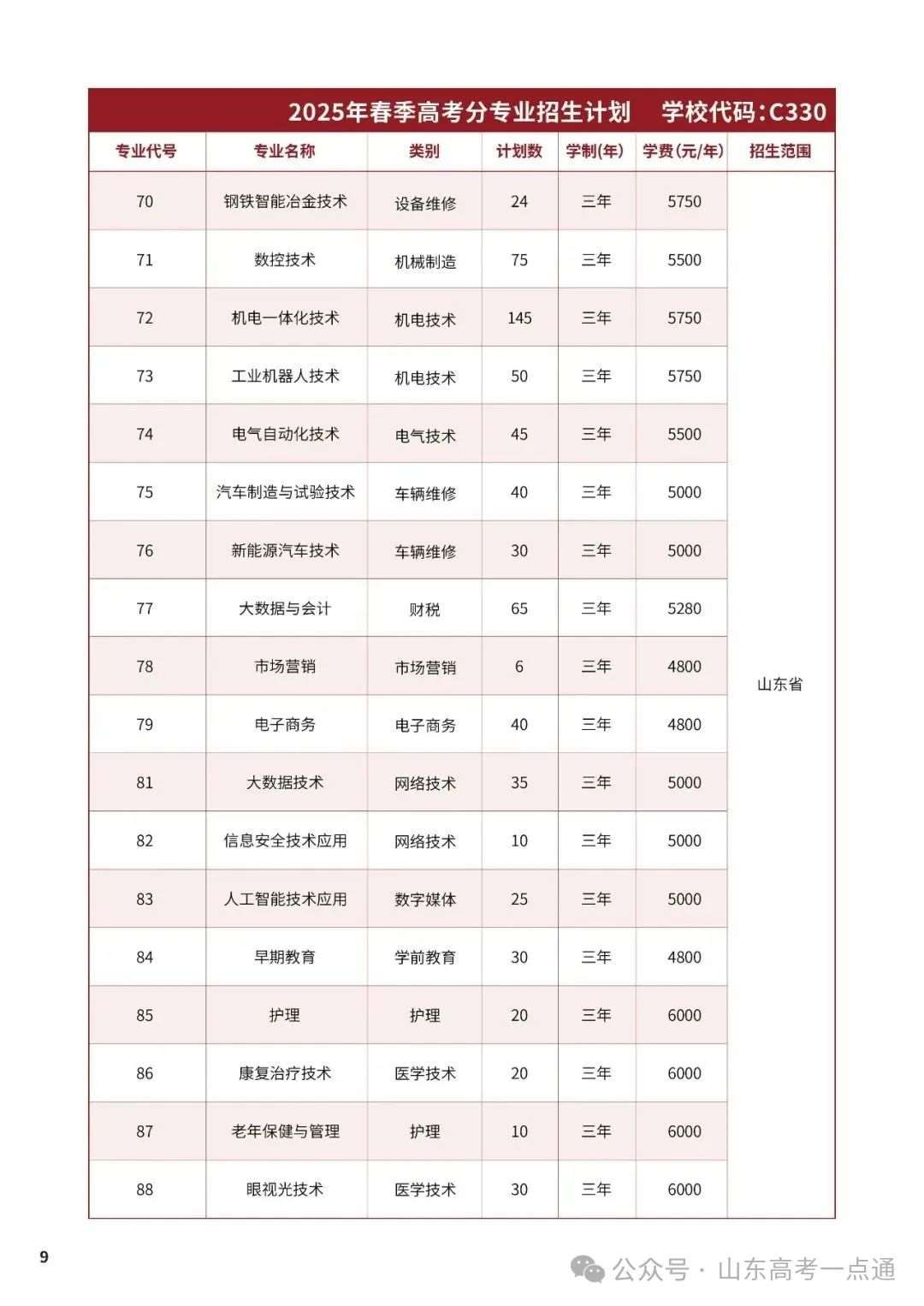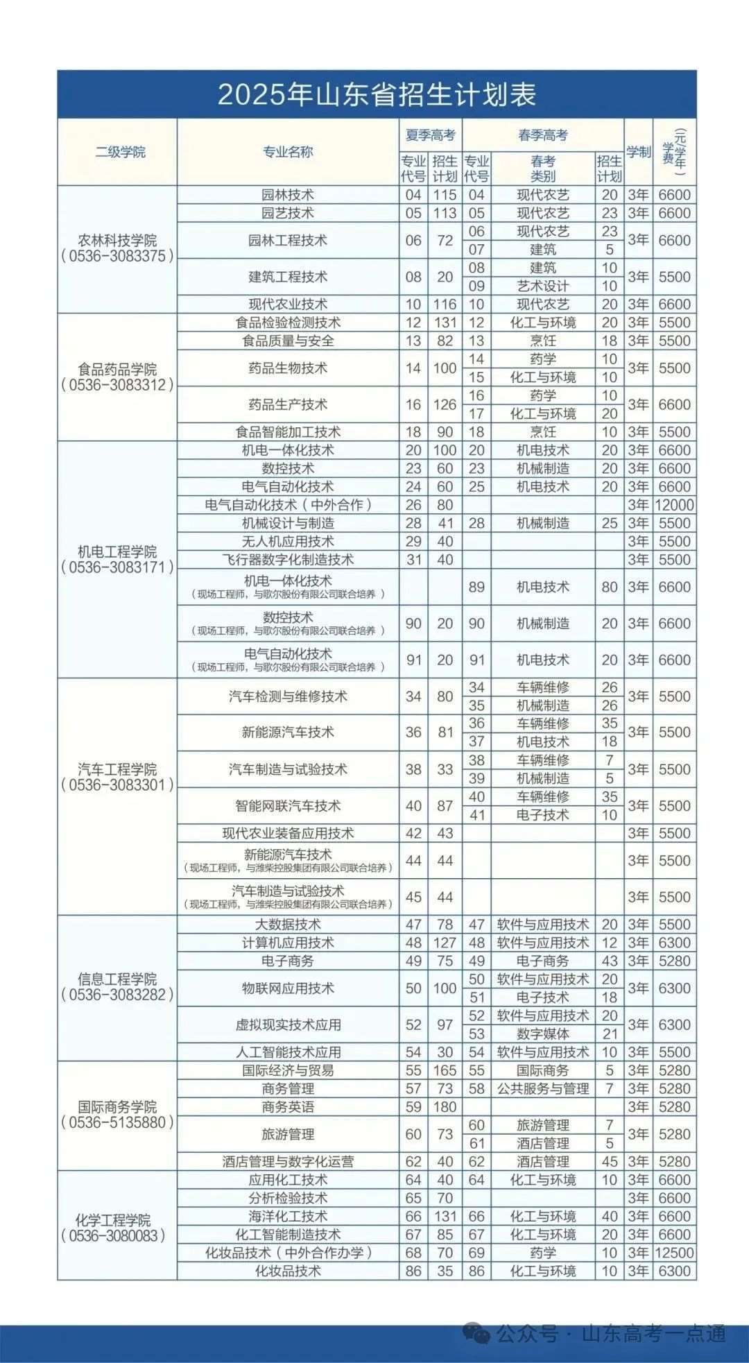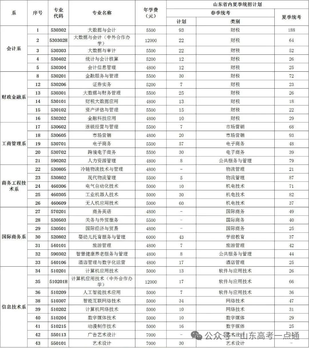 山东省春季高考招生计划