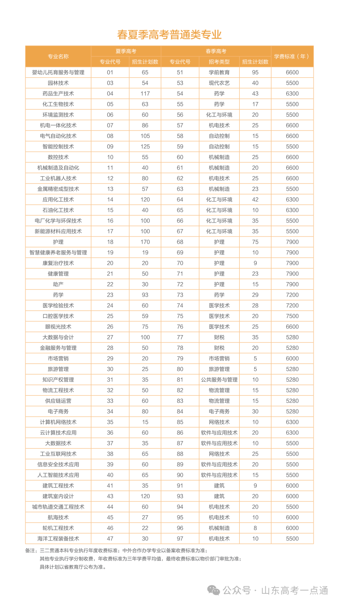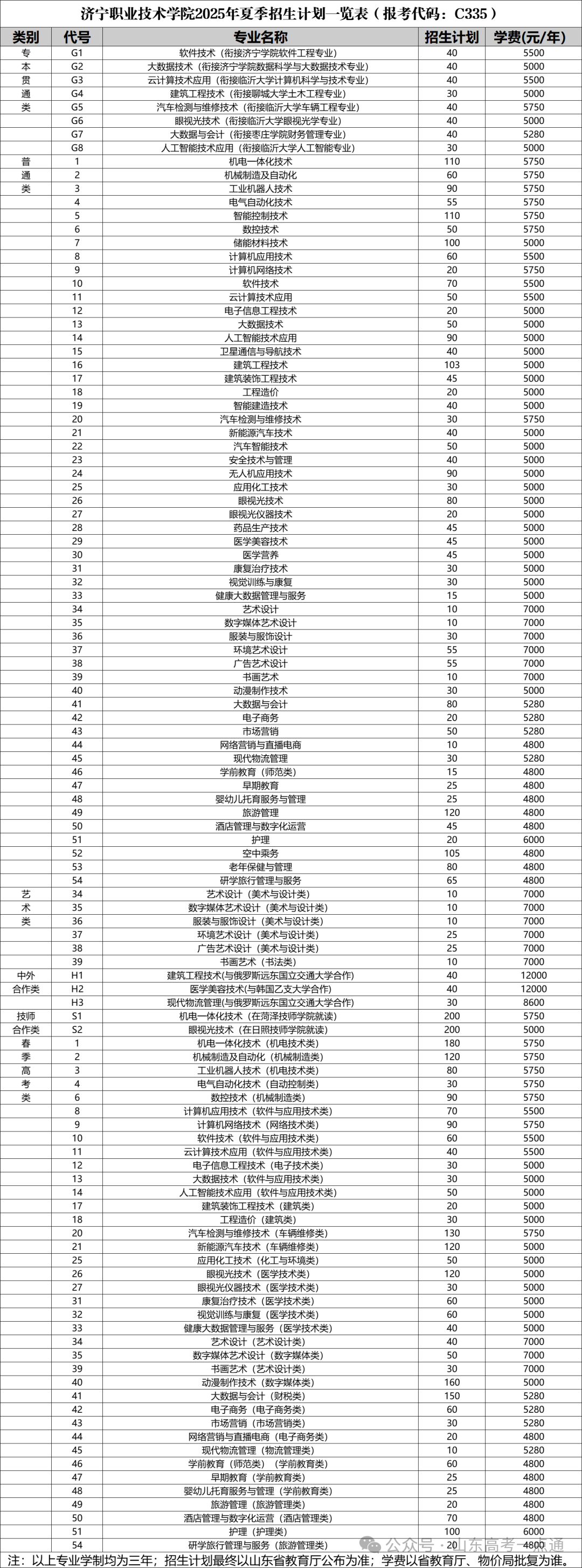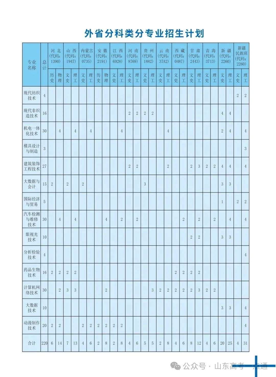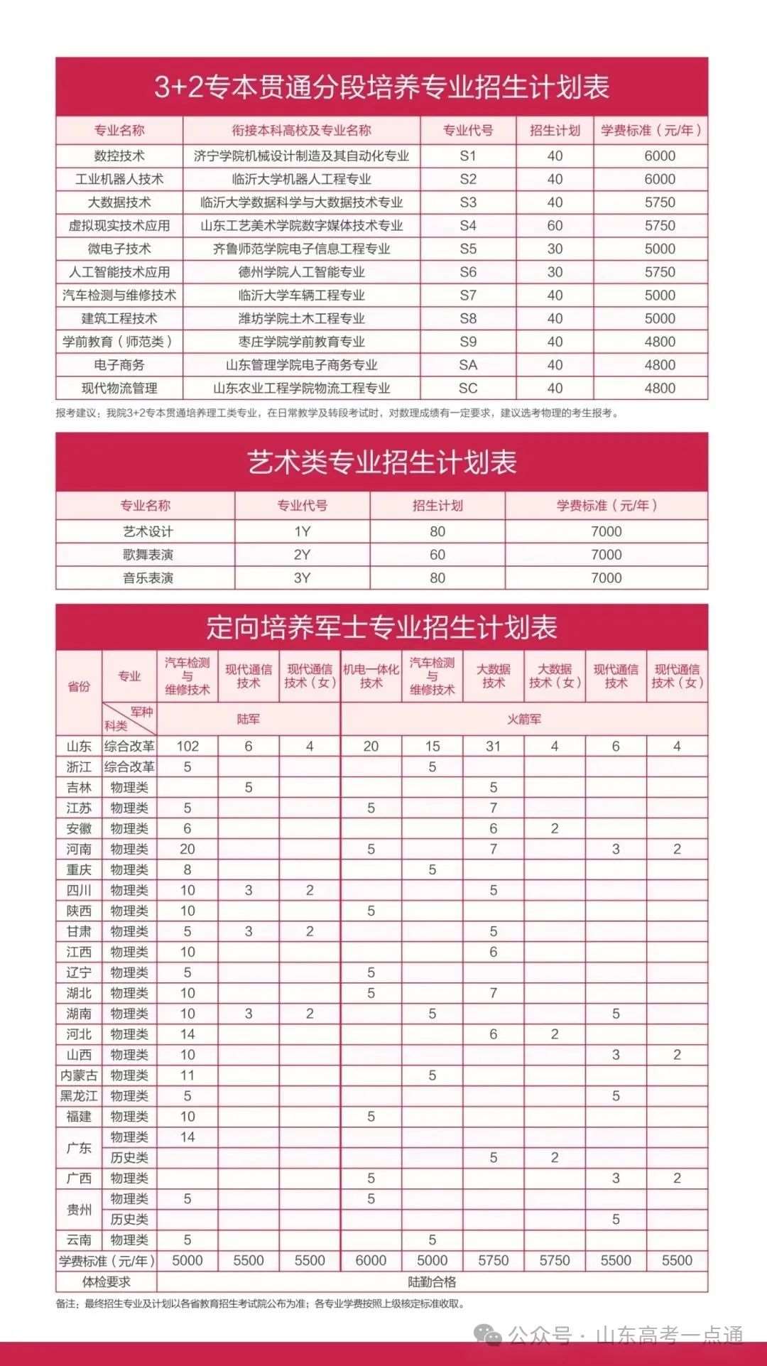 山东省春季高考招生计划