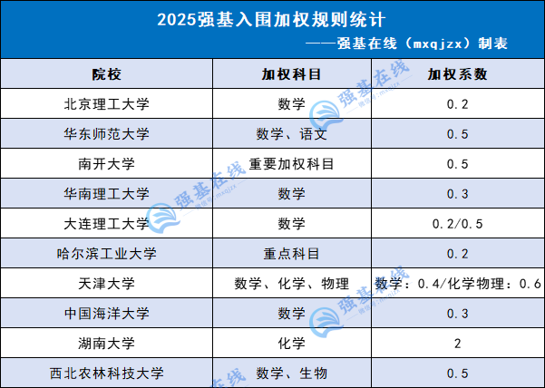 2025年有10所高校实施高考*单科加权入围,相比2024年增加了4所,以下是采用加权入围院校的加权计算方式。