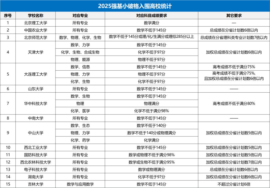 2025年,北理、中农、北师大、天大、大连理工、山大、华科大、中南、中山、西工大、国防科大、西北农林科大、电大、湖大、吉大15校确认有小破格政策。