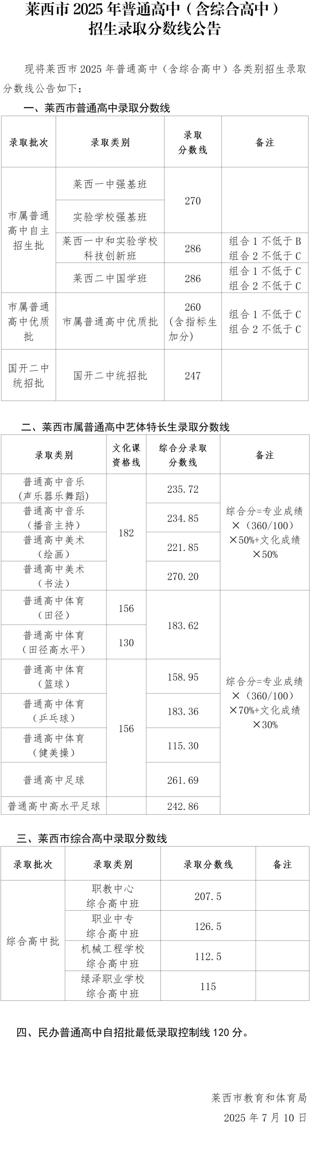 2025年莱西市普高(含综合高中)招生录取分数线