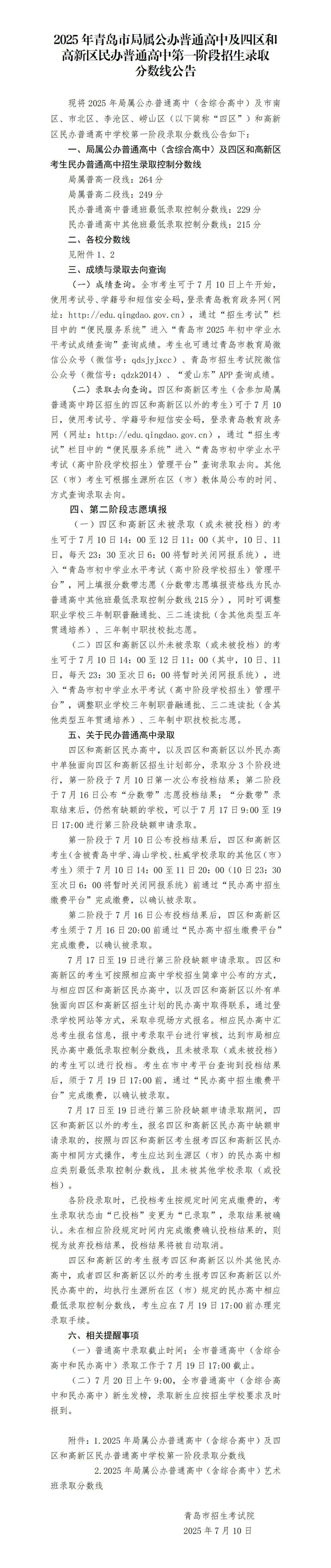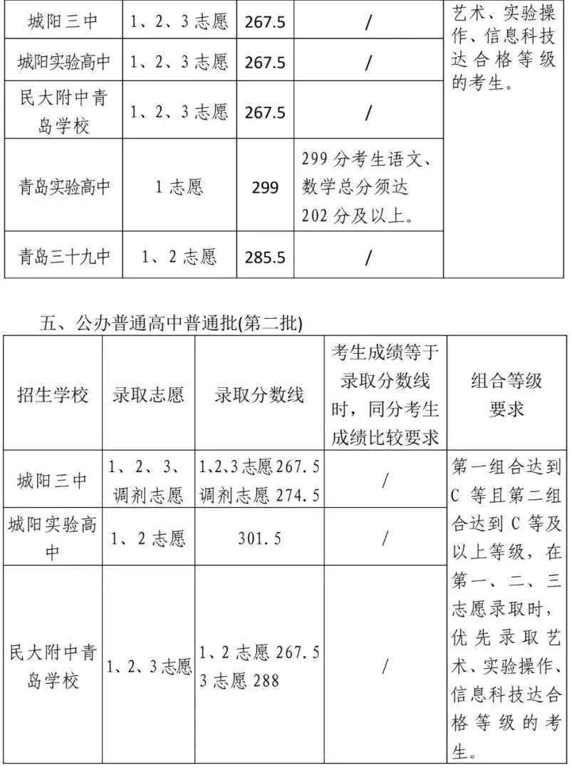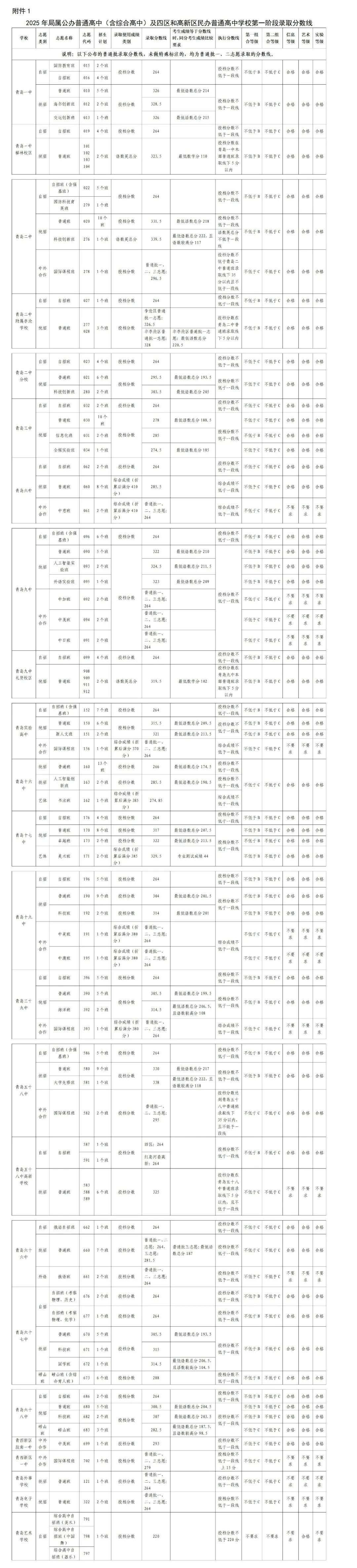 2025年青岛市局属公办普通高中及四区和高新区民办普通高中第一阶段招生录取分数线