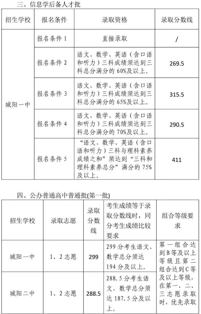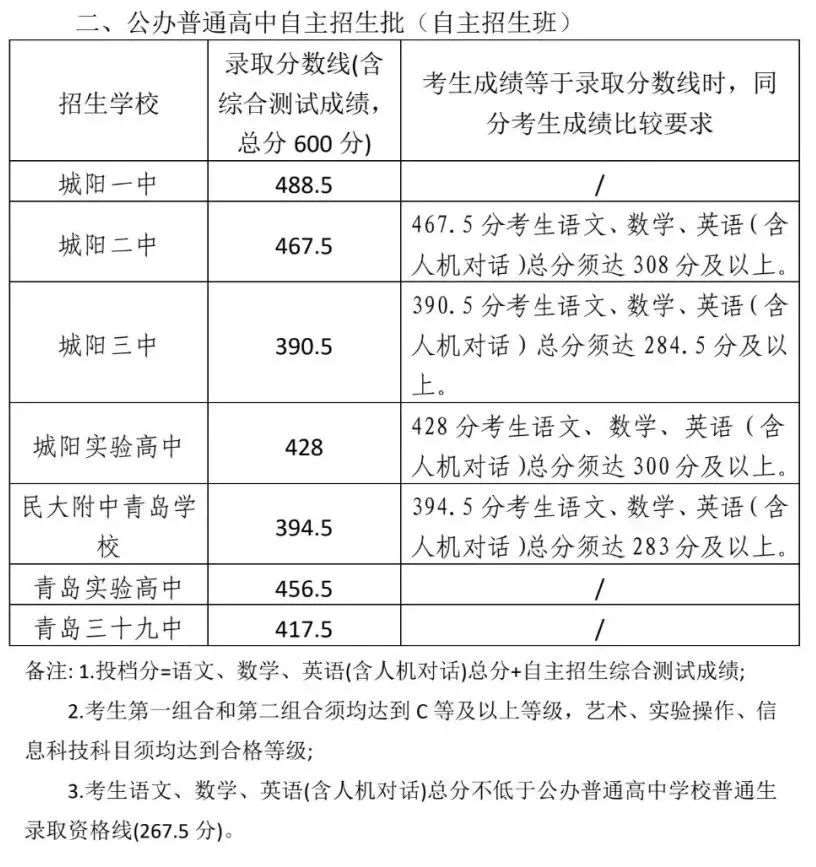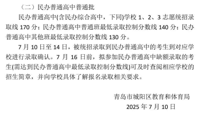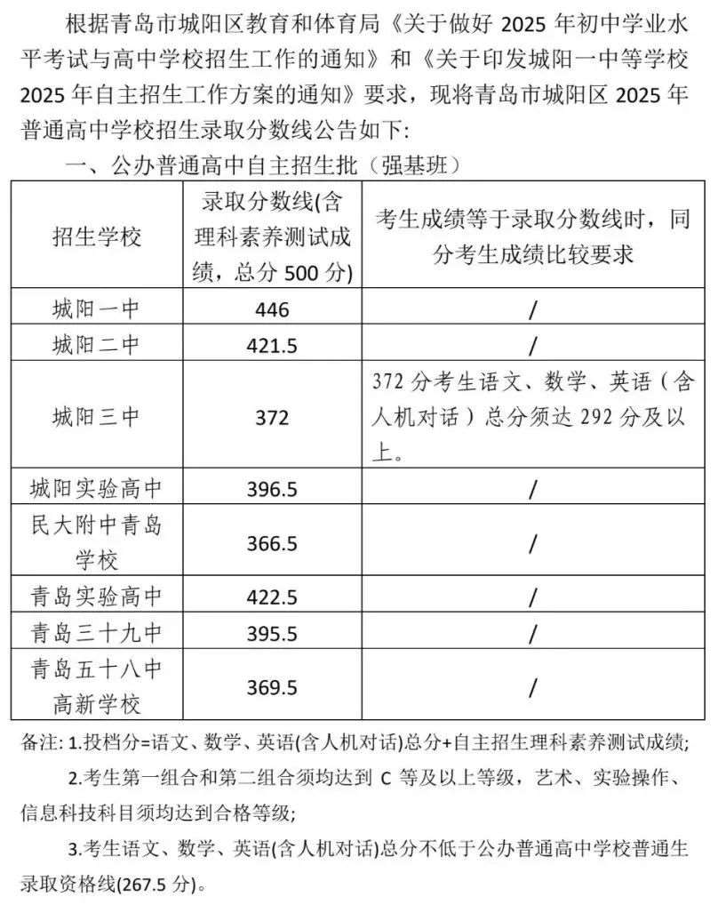 2025城阳区普通高中学校招生录取分数线