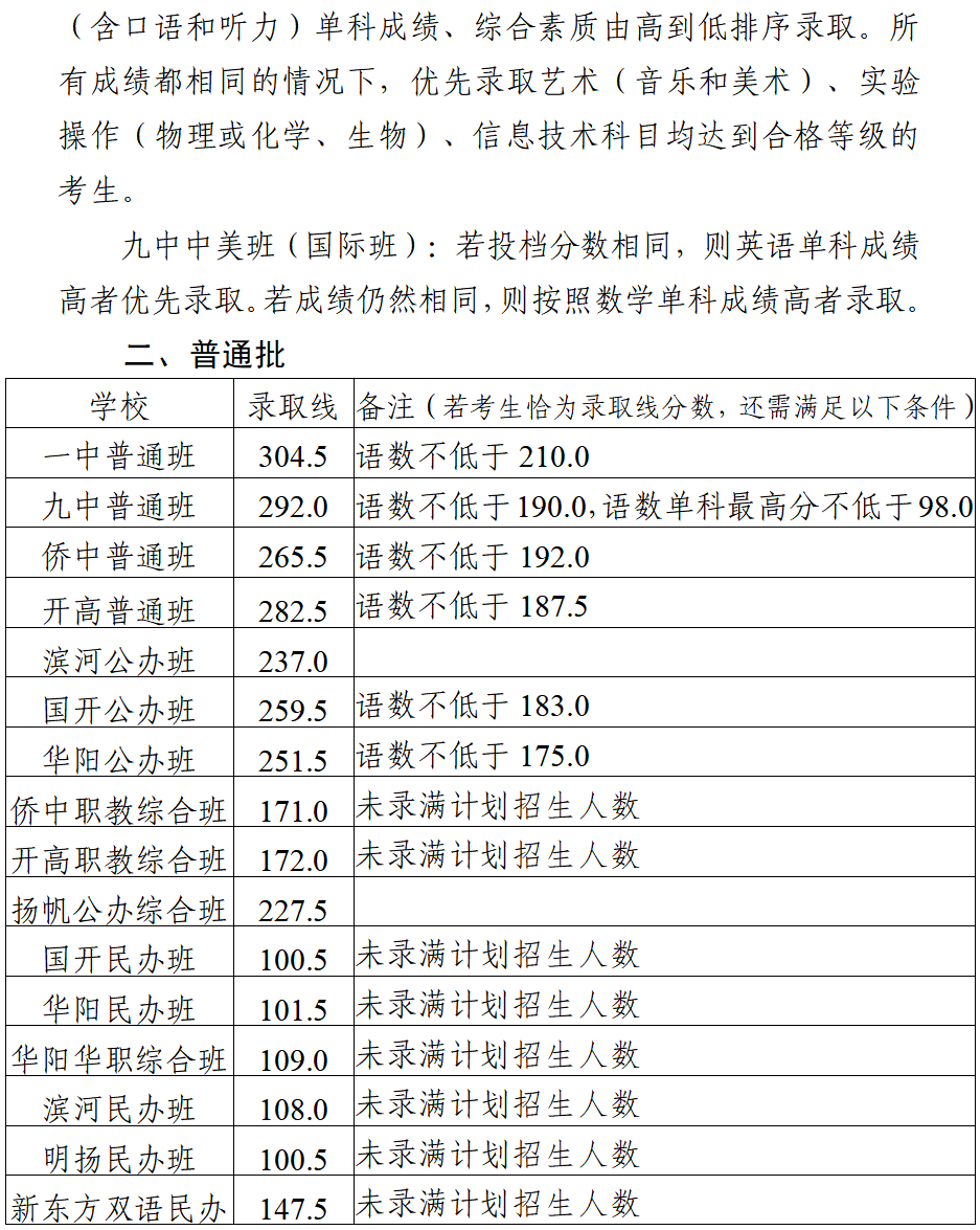 (二)班录取线:305.5分(高于该分考生已经被录取,305.5分同分考生按照规定首先比较语数两科总分,*高者优先录取,语数两科总分*低201分);
