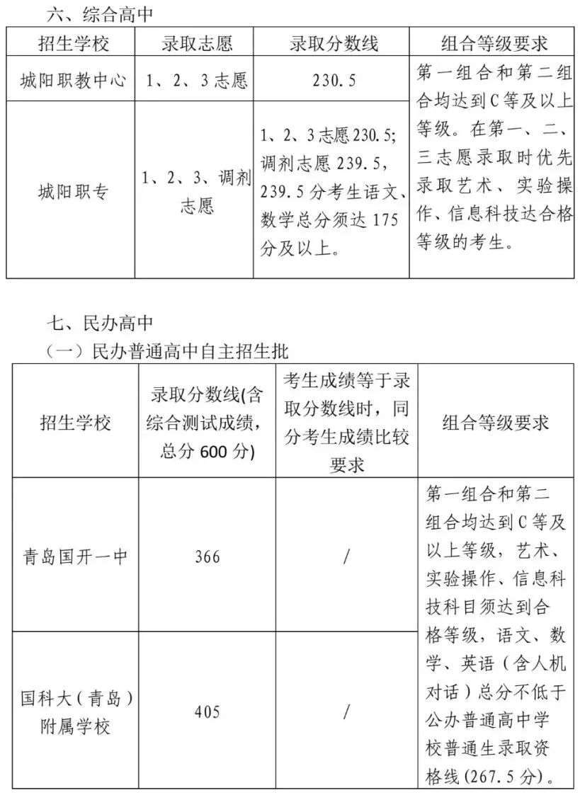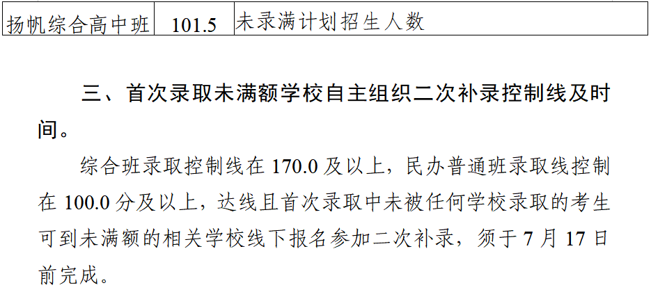 (二)综合高中普通班录取线:140分。