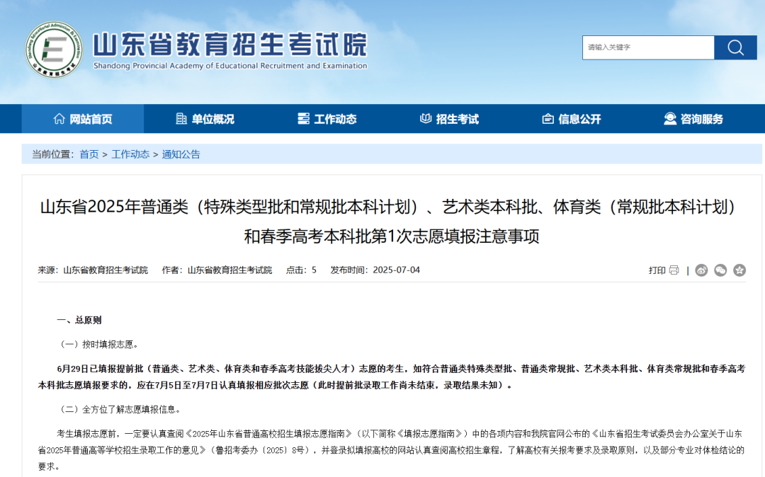 山东省2025年普通类(特殊类型批和常规批本科计划)、艺术类本科批、体育类(常规批本科计划)和春季高考本科批第1次志愿填报注意事项