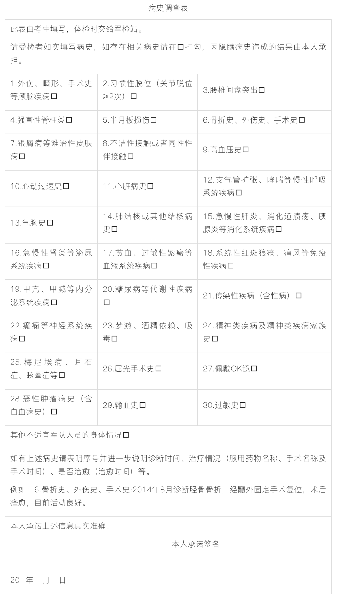 2.在体检等候时,仔细阅读体检指引单背面的病史问卷,如实填写并签字确认。《病史调查表》签字确认后,不得修改。对隐瞒病史或弄虚作假的考生,取消录取资格。