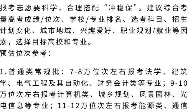 考生可根据上述建议位次填报“稳妥类”志愿,对应调整“冲击类志愿”和“保底类志愿”安排。