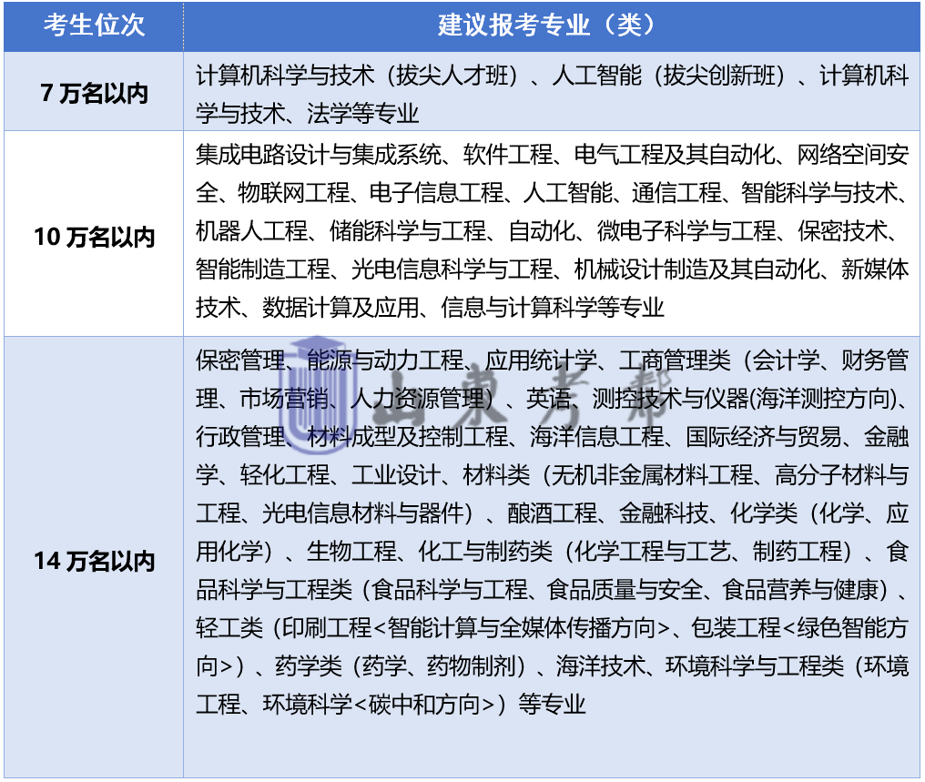 1、位次【4.5万-6.5万名】考生,建议报考我校计算机科学与技术、电气工程及其自动化、电子信息工程、软件工程、自动化、网络空间安全、通信工程会计学、财务管理、经济学等专业;2、位次【6.5万-8.5万名】考生,建议报考我校机器人工程、智能制造工程、数学与应用数学、机械设计制造及其自动化、测控技术与仪器、新能源汽车工程、信息管理与信息系统、工业工程、交通工程、车辆工程、集成电路设计与集成系统、统计学、网络与新媒体、英语等专业;