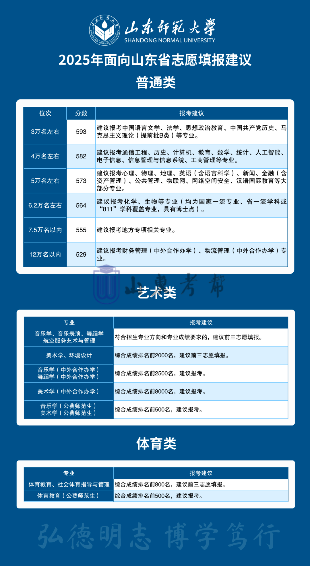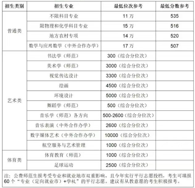 艺术、体育类专业:统考专业参照2024年我校录取最低位次;美术类综合分位次13000、体育类综合分位次4200、舞蹈学(培养中国舞方向,非中国舞慎报)综合分位次2000、书法学综合分位次600、音乐学(音乐教育)综合分位次3600,报考我校希望较大。艺术专业文化*和专业*必须过资格线。
