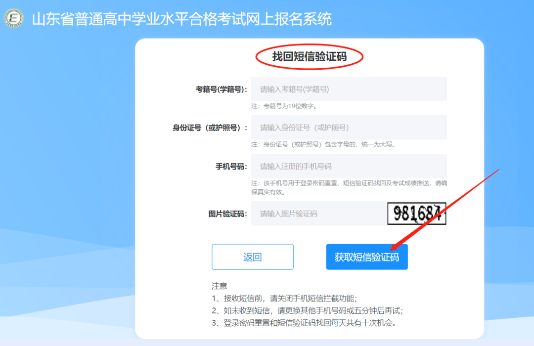 在登陆页面中点击【找回短信验证码】后,在跳转页面中,依次输入考籍号(学籍号)、身份证号(或护照号)、常用手机号码、图片验证码,确认填写无误后,点击【获取短信验证码】,如下图:
