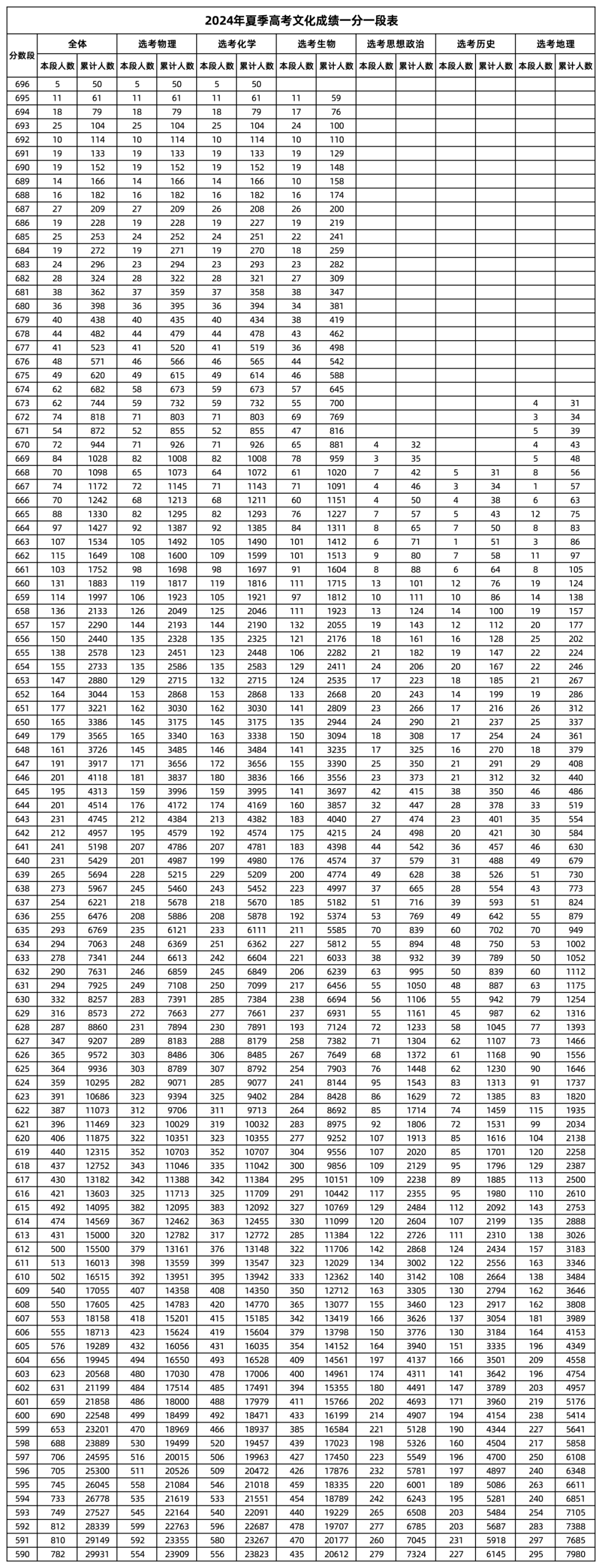 2024年山东夏季高考文化*一分一段表