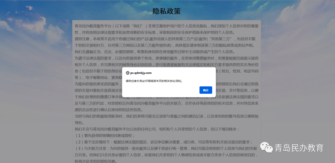 5、请各位家长点击“确定”按钮,务必仔细阅读本页的相关协议须知,请仔细阅读“隐私政策”“免责声明”两项平台协议,然后点击“我已阅读并同意”按钮进行下一步操作。