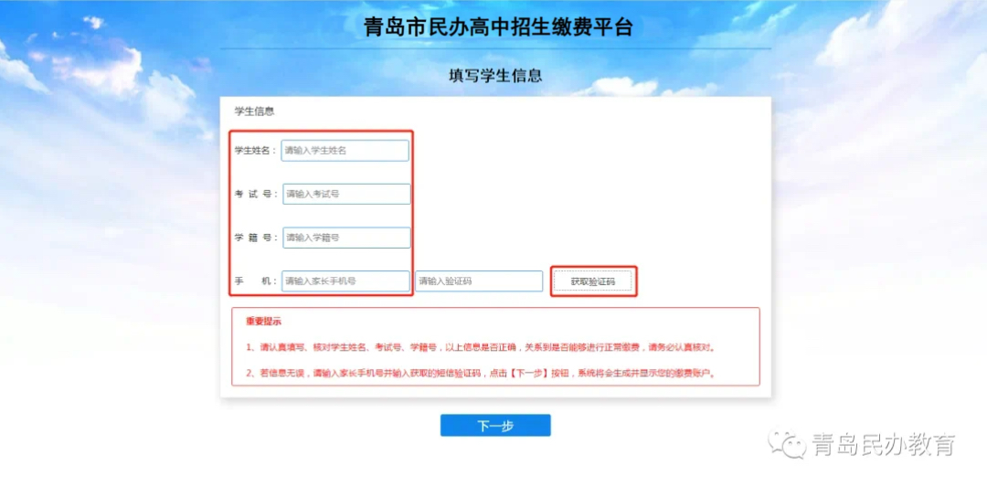 4、学生信息填写前请首先阅读本页面红色字体部分“重要提示”,填写“学生信息”,包括“学生姓名”“考试号”“学籍号”“手机”“待缴费账号信息”等信息,注意填写完学生手机号之后,点击“获取验证码”按钮,将手机号收到的验证码输入方框中,然后点击“下一步”。