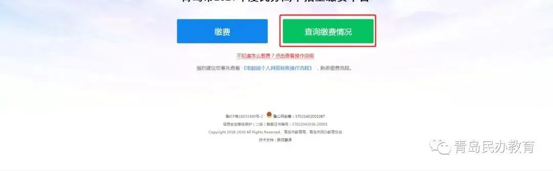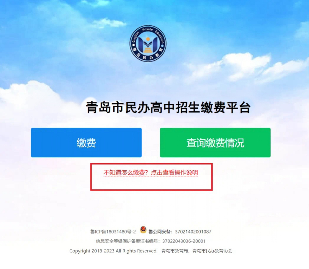 登录https://pc.qdmbjy.com进入青岛民办教育平台,根据首页面提示按钮——“青岛市2025年度民办高中招生缴费”界面提示逐步进行,直至完成缴费操作。