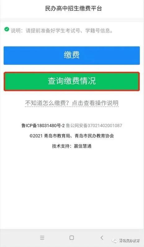 关注“青岛民办教育”进入公众号后点击下方“便民服务-民办高中缴费”菜单,根据页面提示进行线上手机缴费账号信息查询。