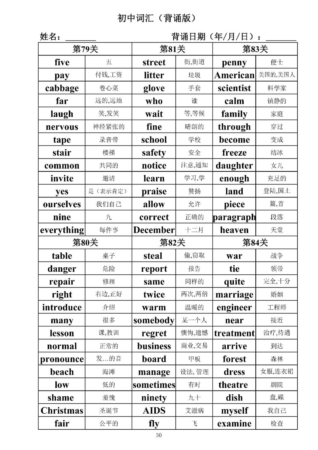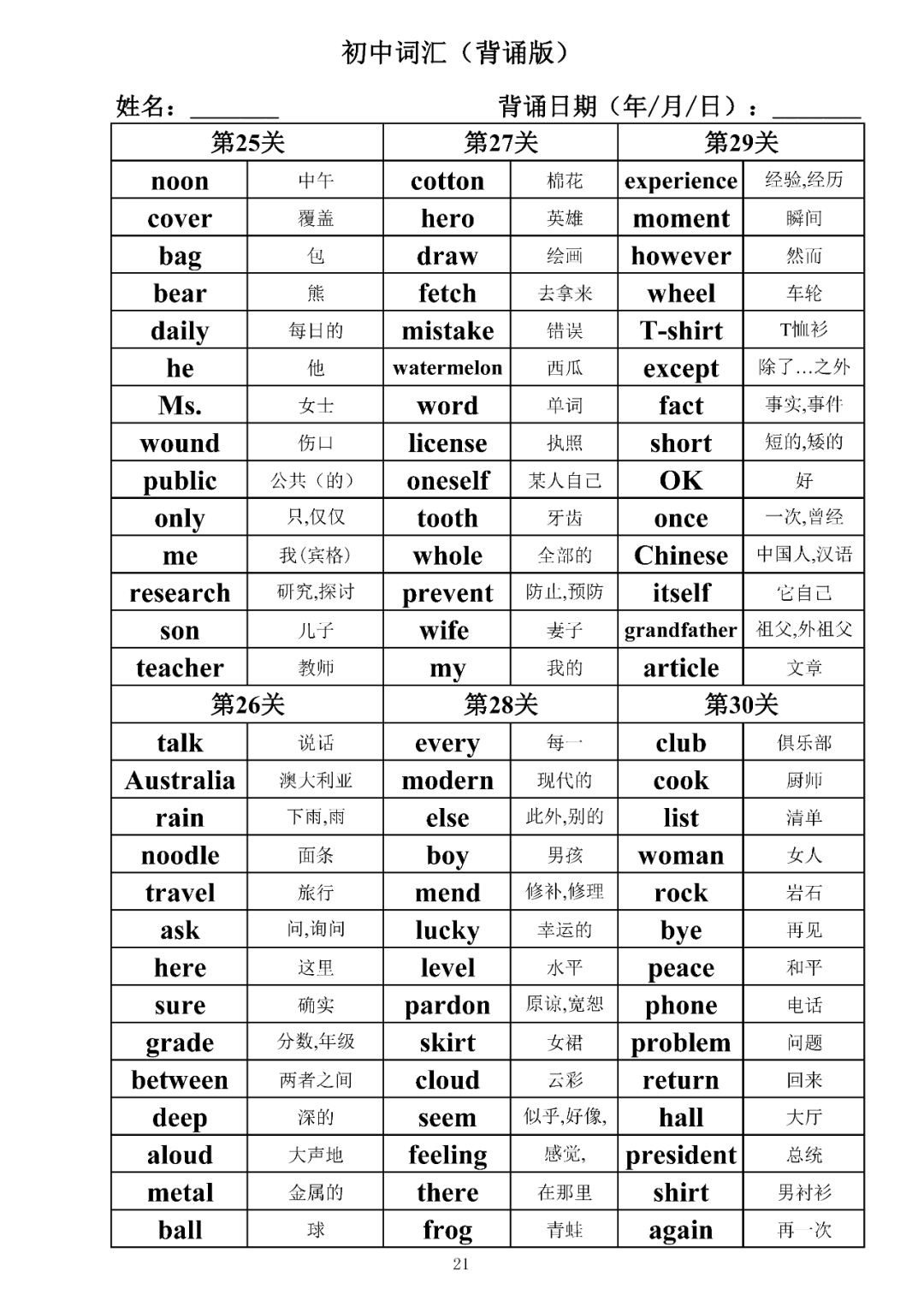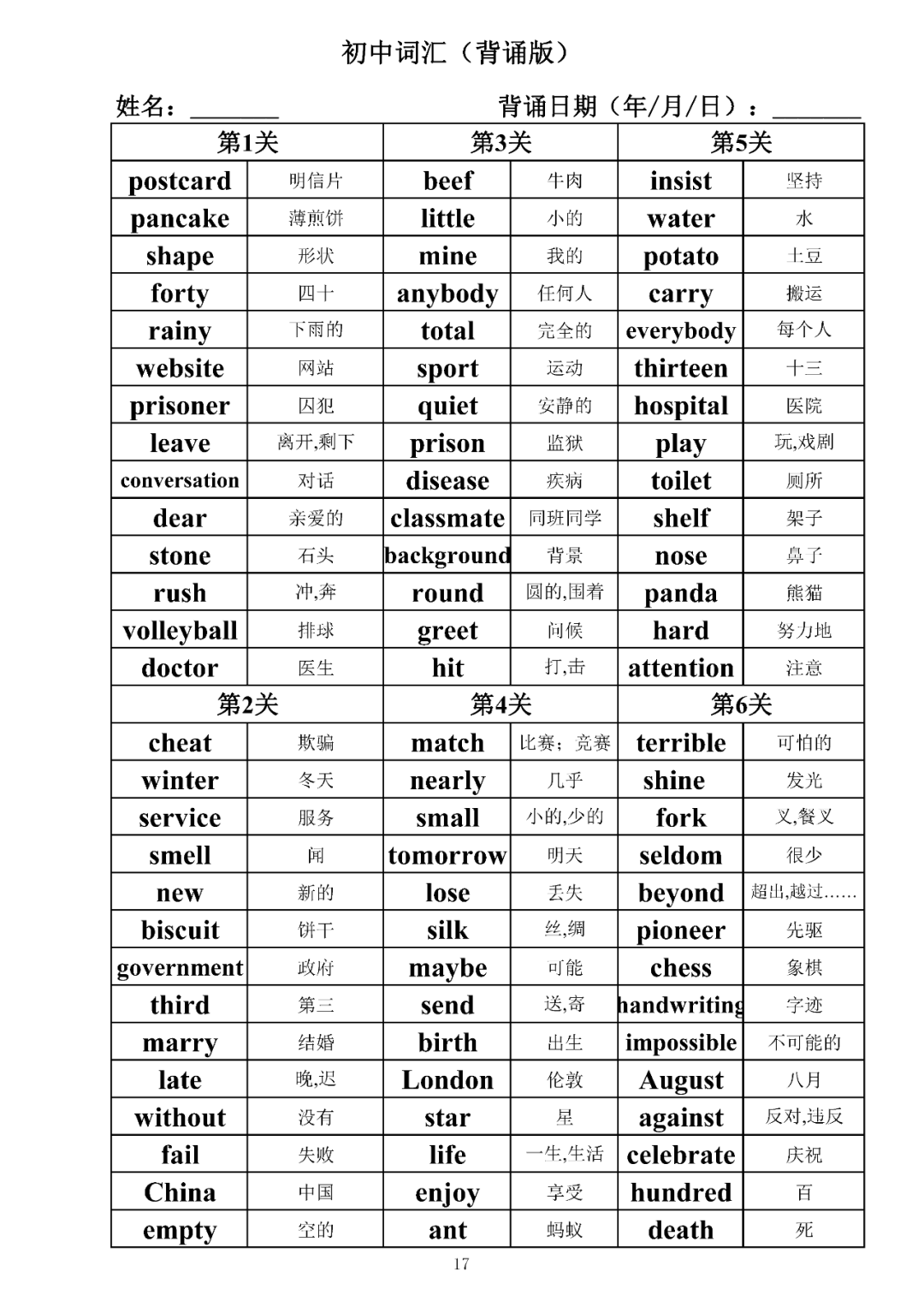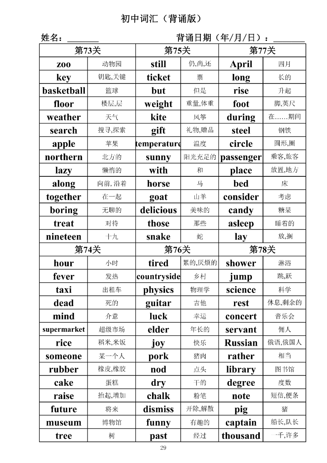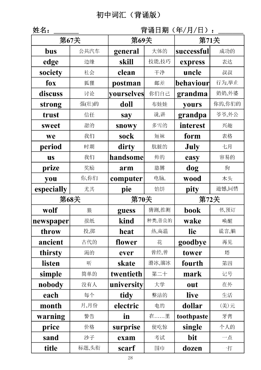 词汇是语言的基本材料,是语言的三大要素之一,掌握好词汇是学好英语的重要基石。离开词汇,语言就失去了实际意义。由此可见,词汇教学在语言教学中占有重要的地位。今天为同学们整理了初中词汇背诵版+检测版,需要的同学收藏起来学习。
