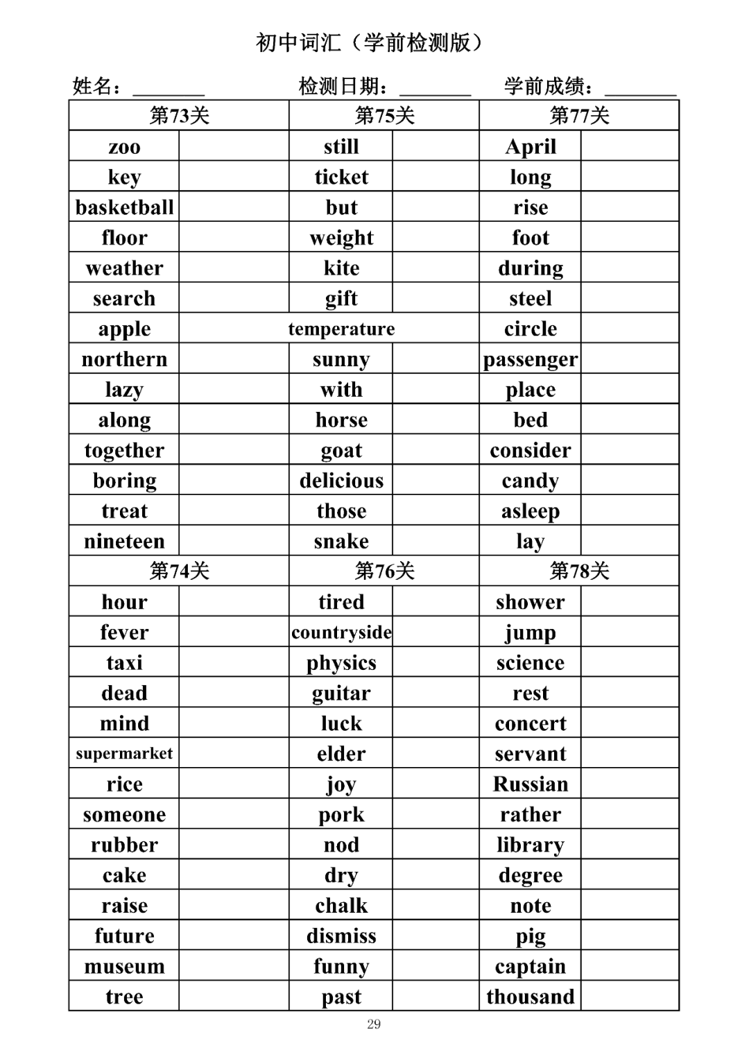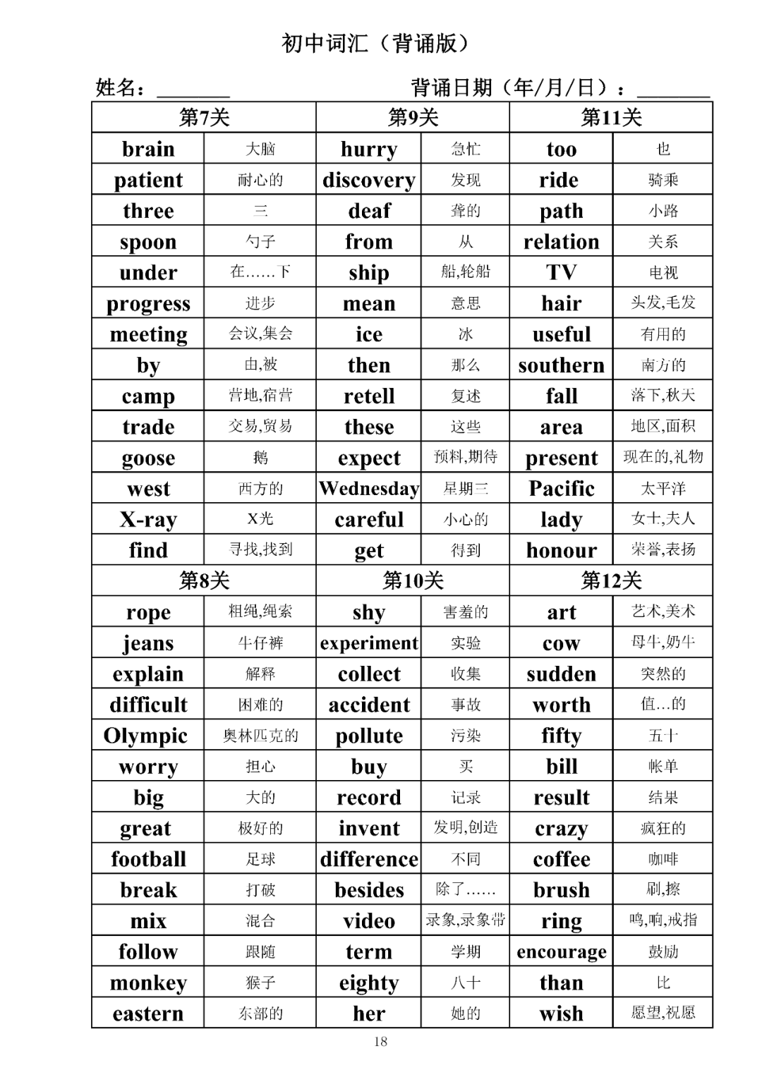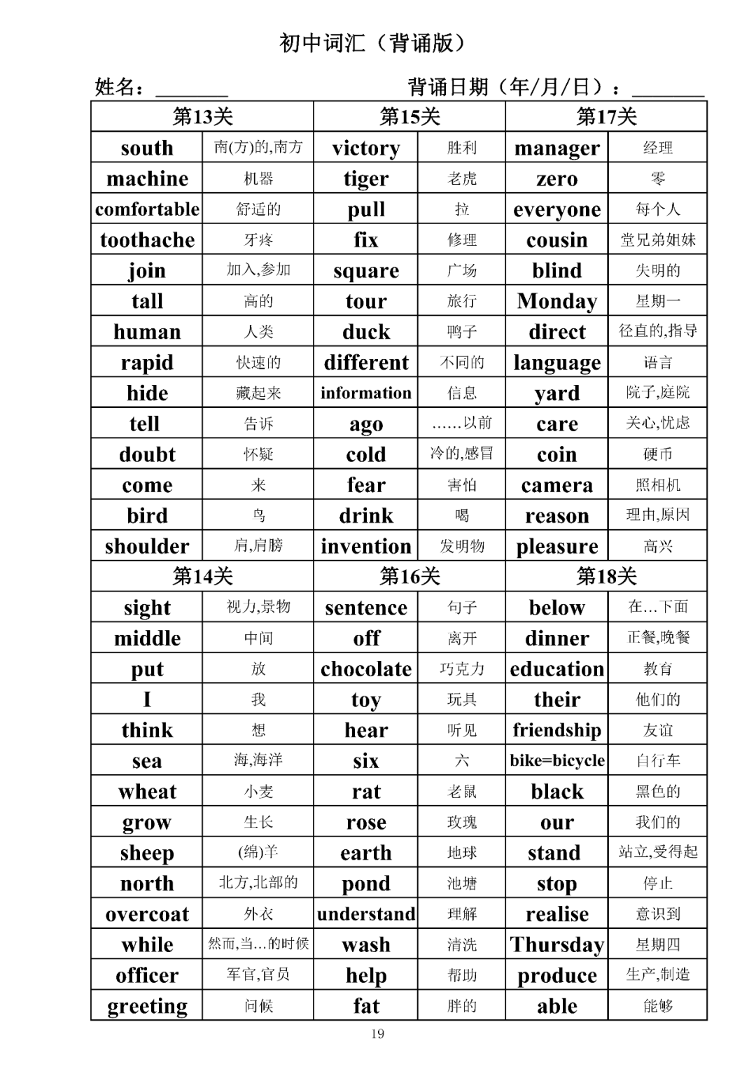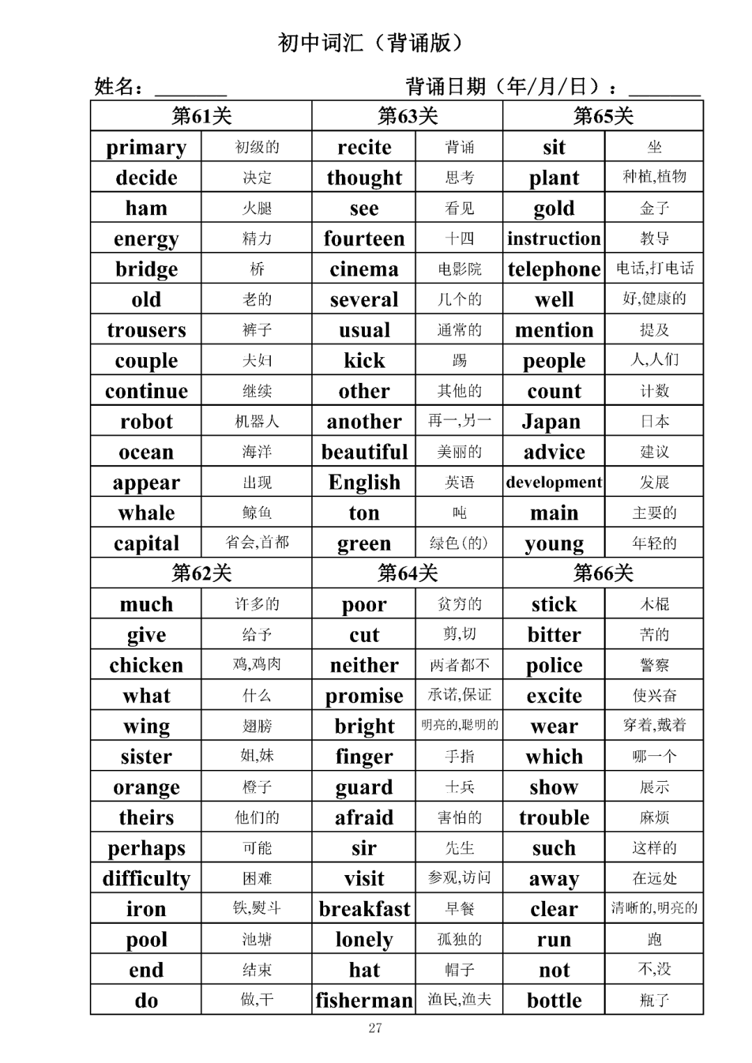 词汇是语言的基本材料,是语言的三大要素之一,掌握好词汇是学好英语的重要基石。离开词汇,语言就失去了实际意义。由此可见,词汇教学在语言教学中占有重要的地位。今天为同学们整理了初中词汇背诵版+检测版,需要的同学收藏起来学习。