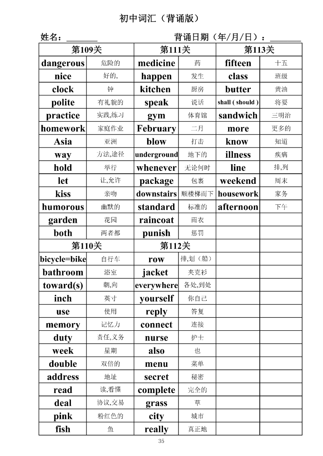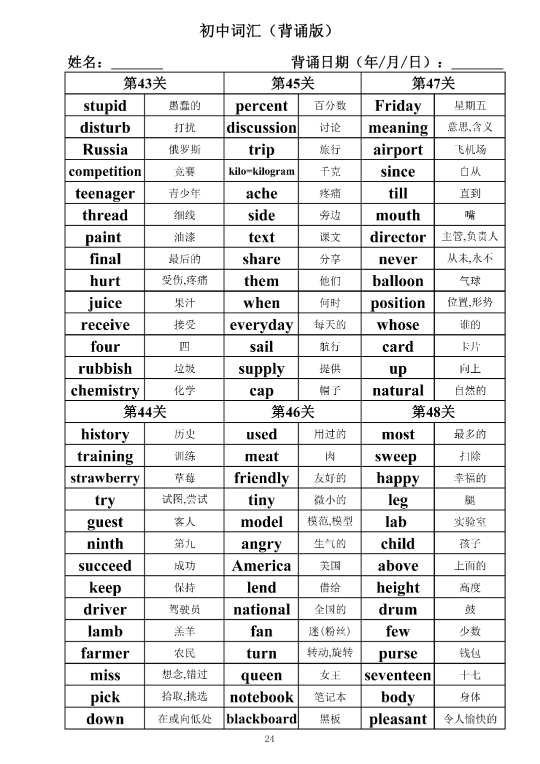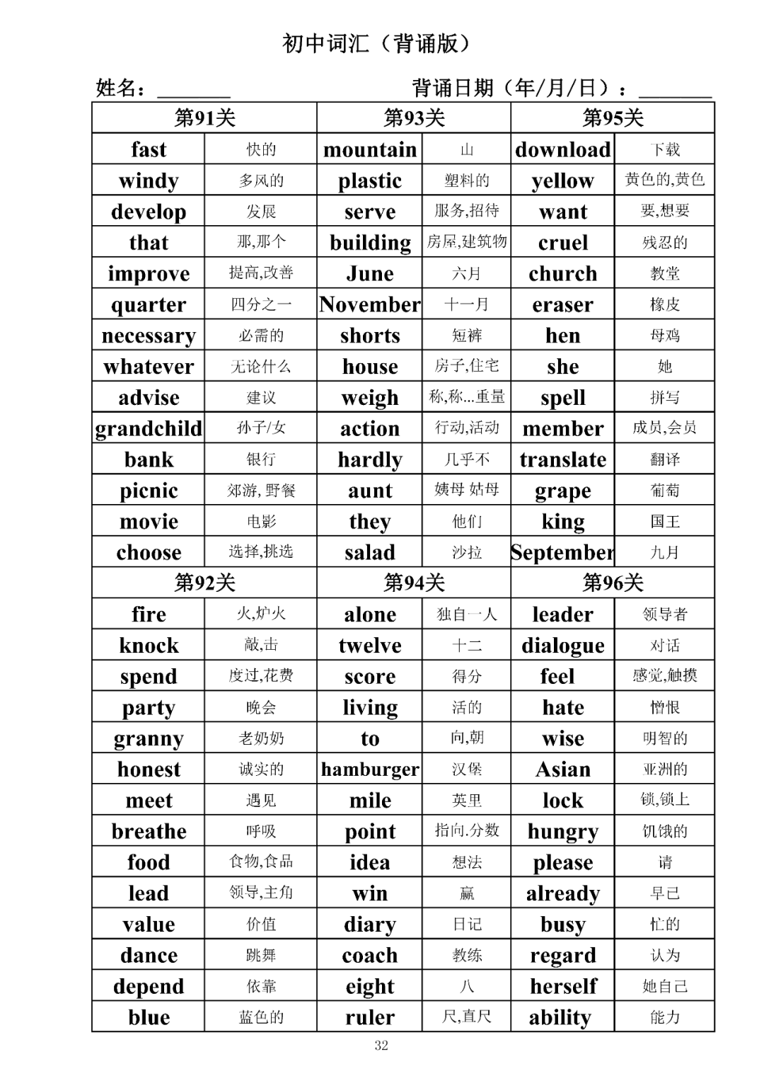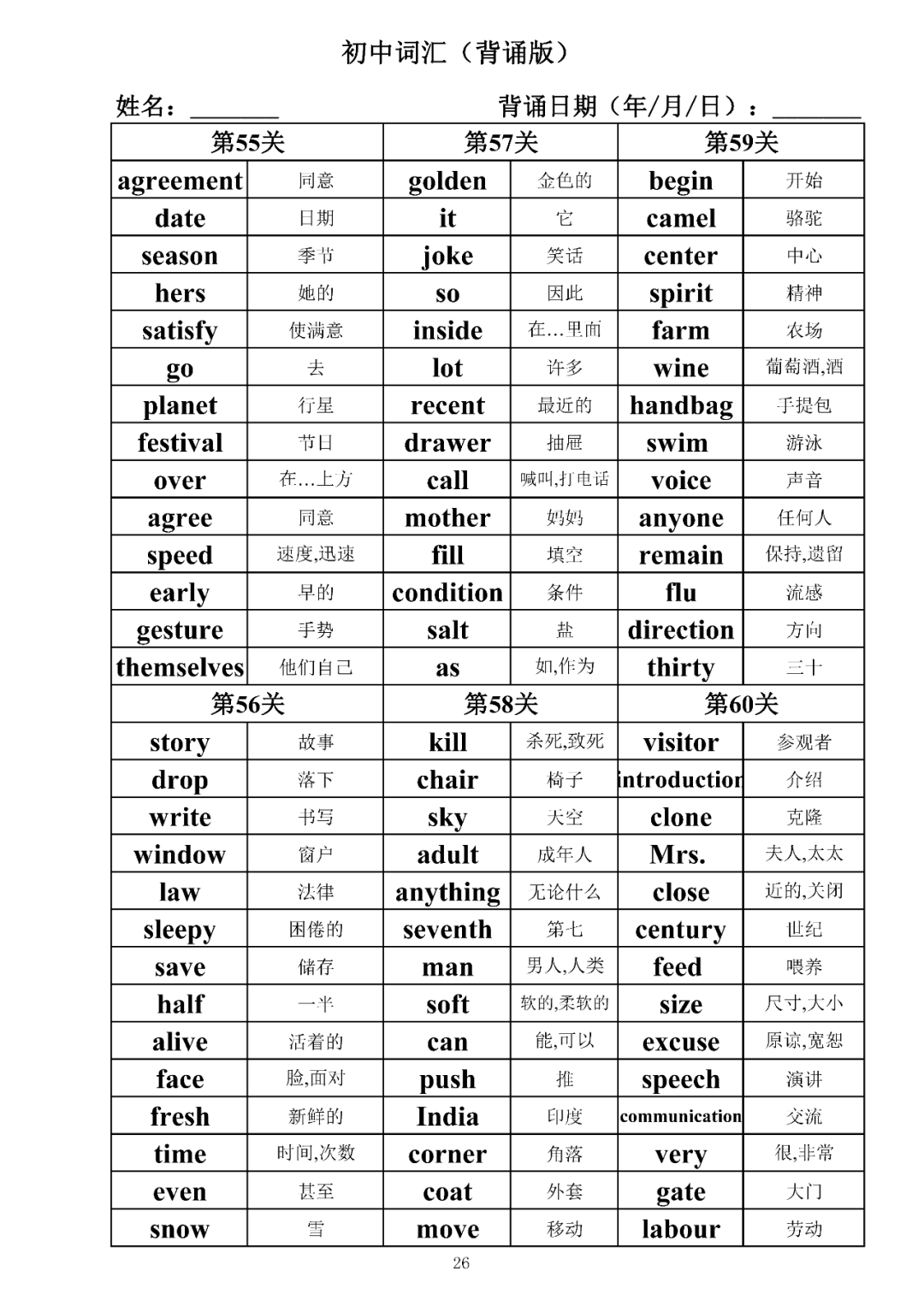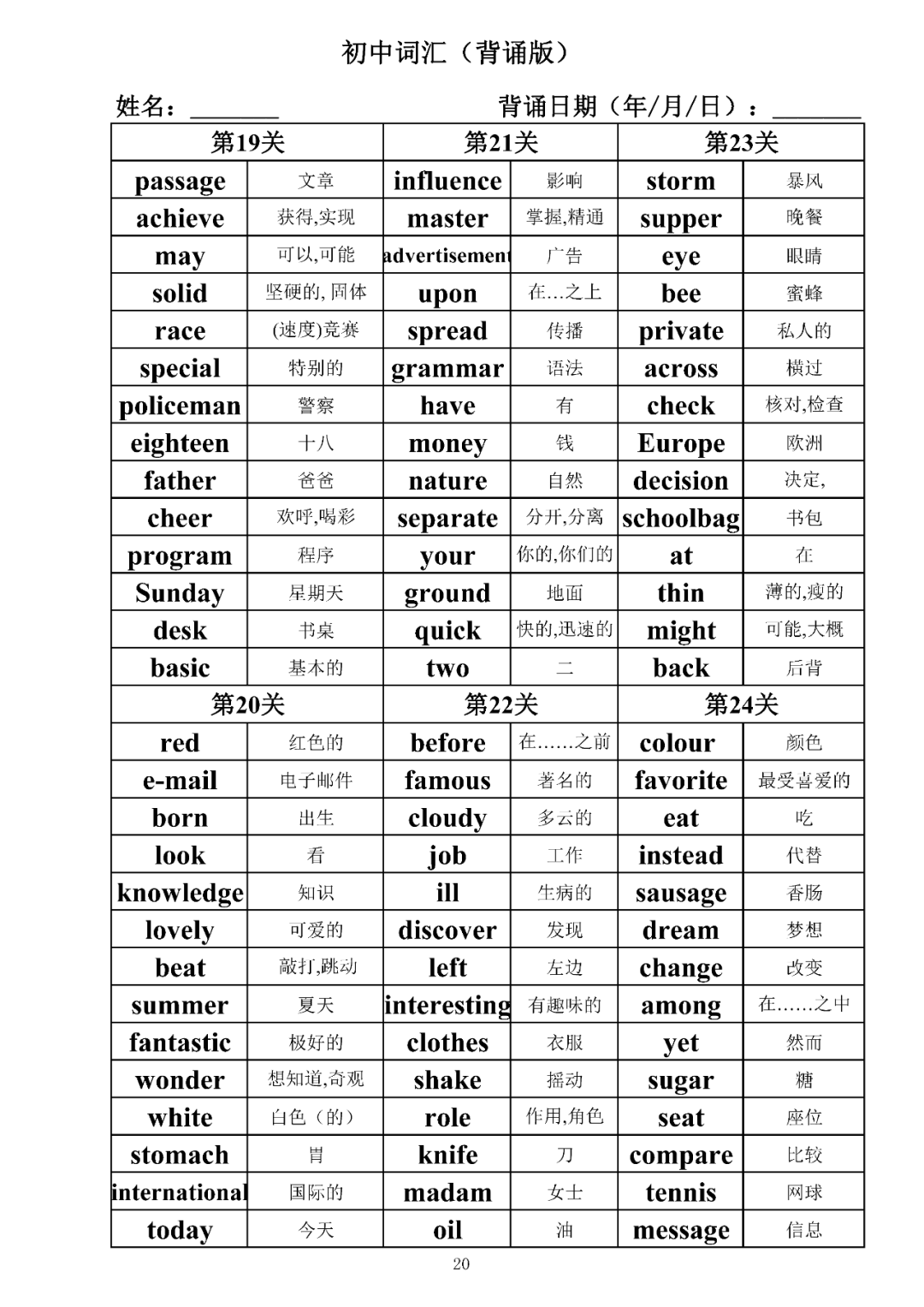 词汇是语言的基本材料,是语言的三大要素之一,掌握好词汇是学好英语的重要基石。离开词汇,语言就失去了实际意义。由此可见,词汇教学在语言教学中占有重要的地位。今天为同学们整理了初中词汇背诵版+检测版,需要的同学收藏起来学习。