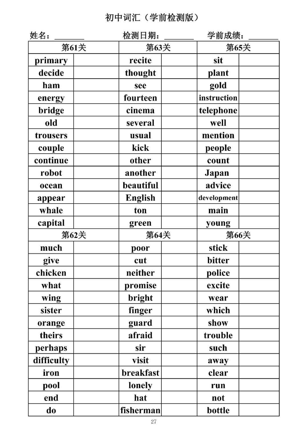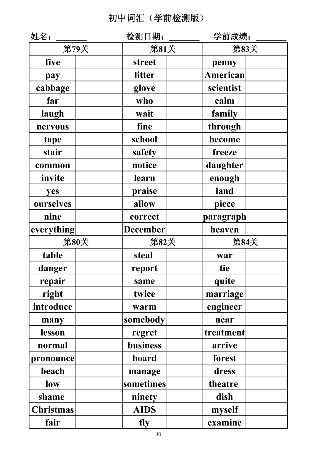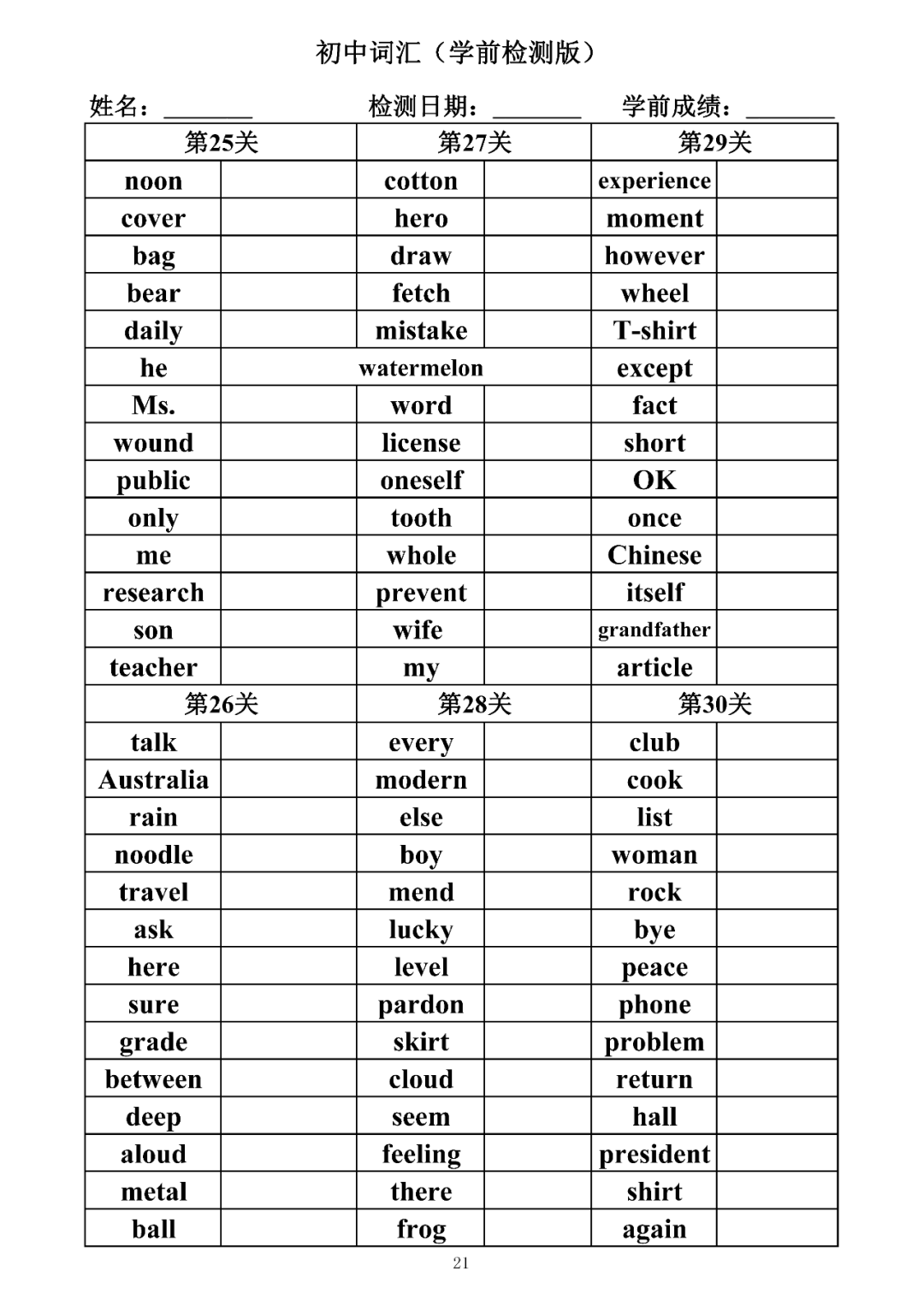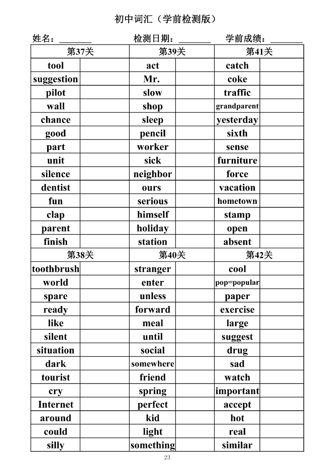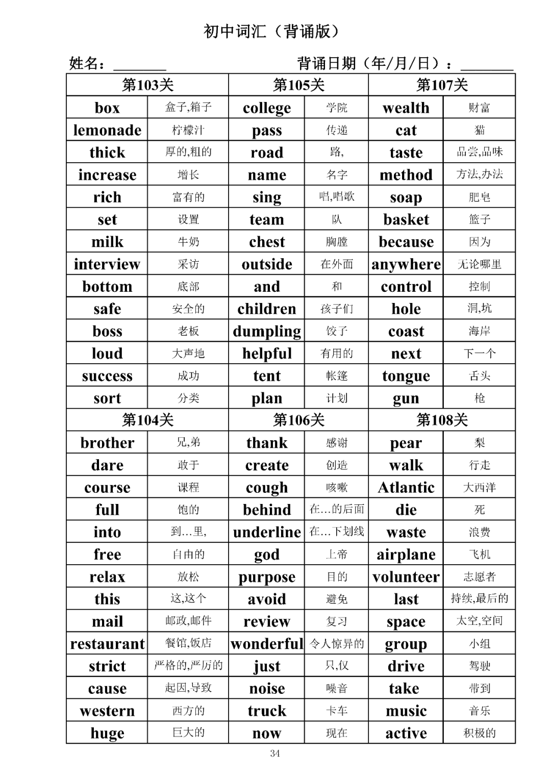 词汇是语言的基本材料,是语言的三大要素之一,掌握好词汇是学好英语的重要基石。离开词汇,语言就失去了实际意义。由此可见,词汇教学在语言教学中占有重要的地位。今天为同学们整理了初中词汇背诵版+检测版,需要的同学收藏起来学习。
