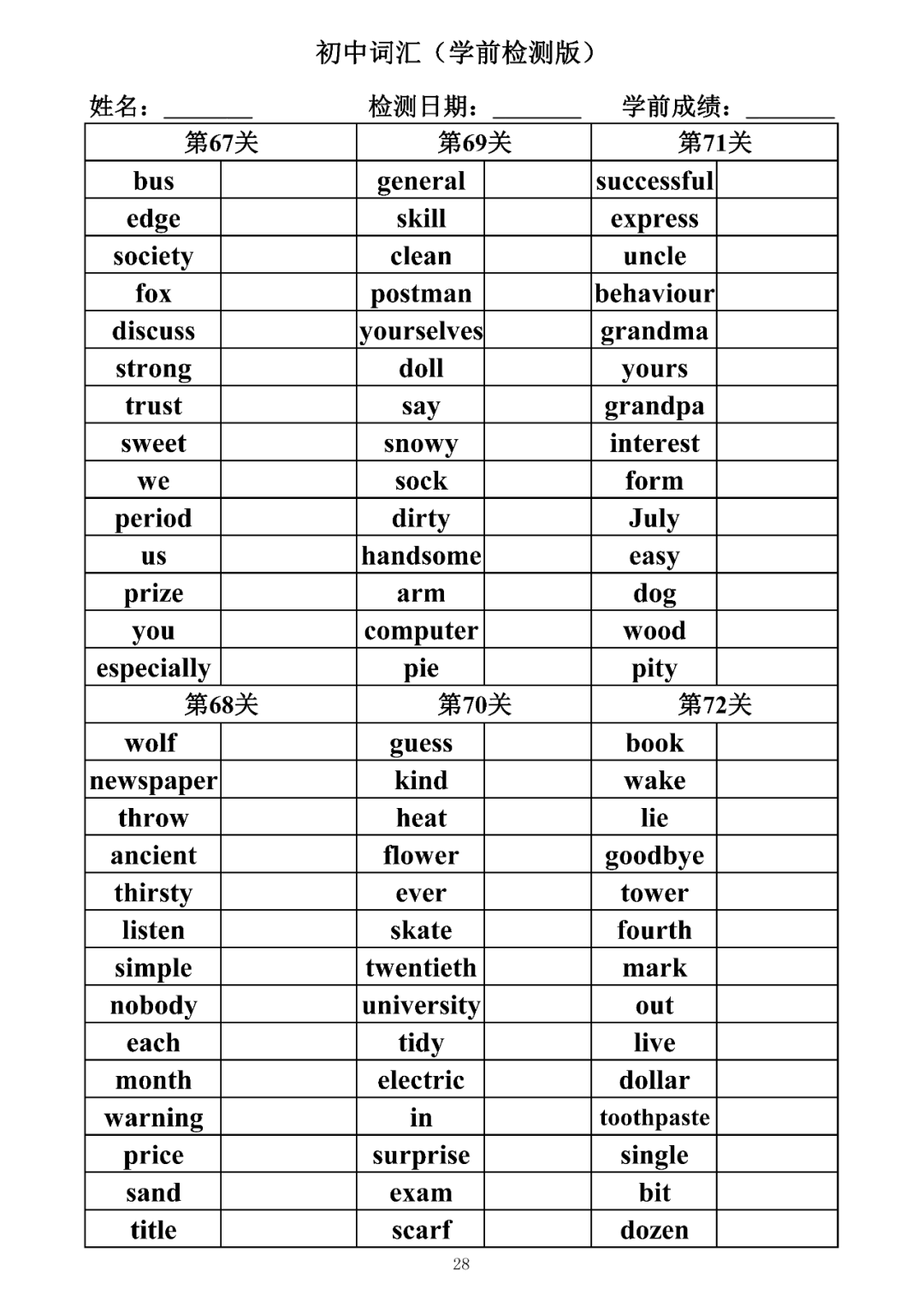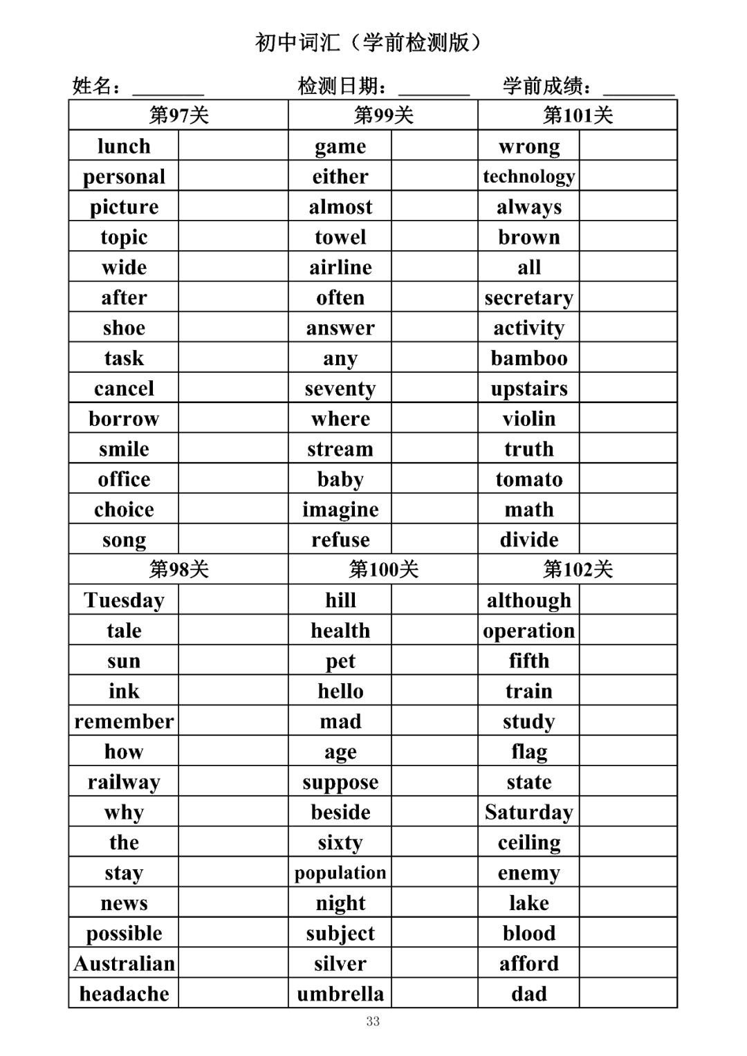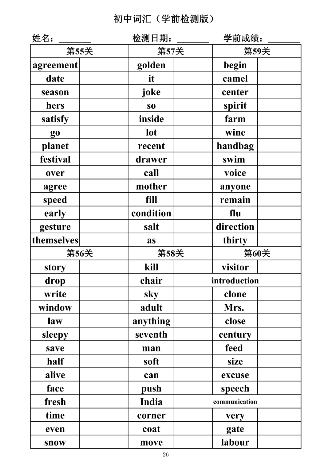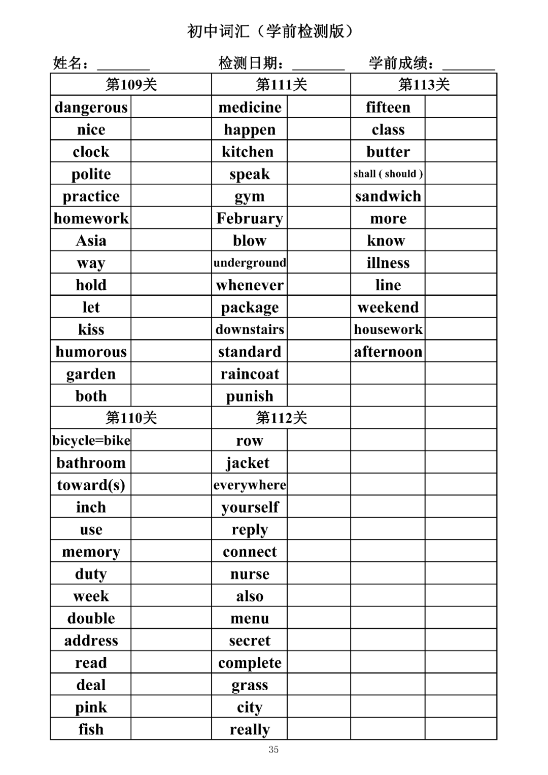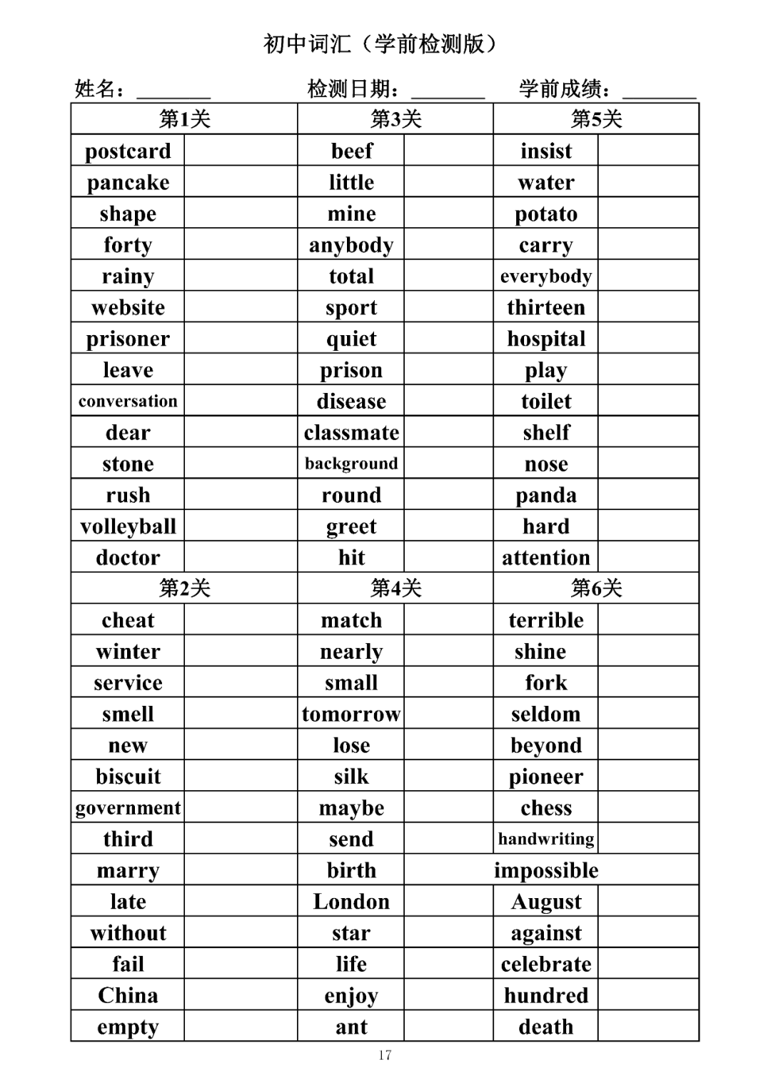 词汇是语言的基本材料,是语言的三大要素之一,掌握好词汇是学好英语的重要基石。离开词汇,语言就失去了实际意义。由此可见,词汇教学在语言教学中占有重要的地位。今天为同学们整理了初中词汇背诵版+检测版,需要的同学收藏起来学习。