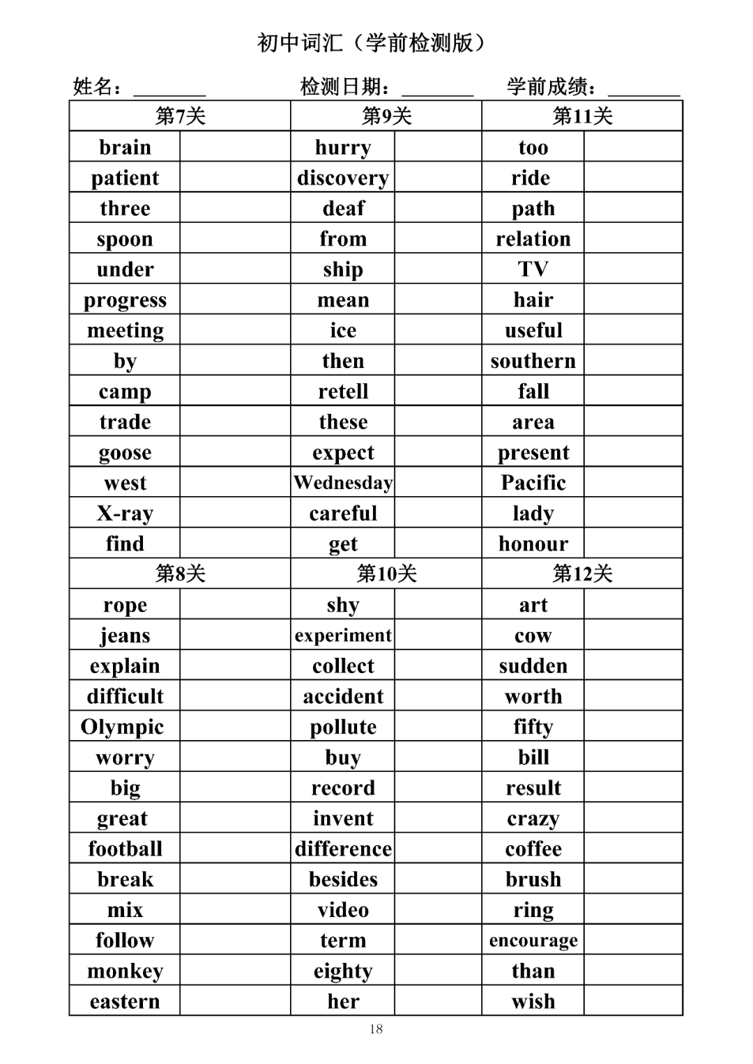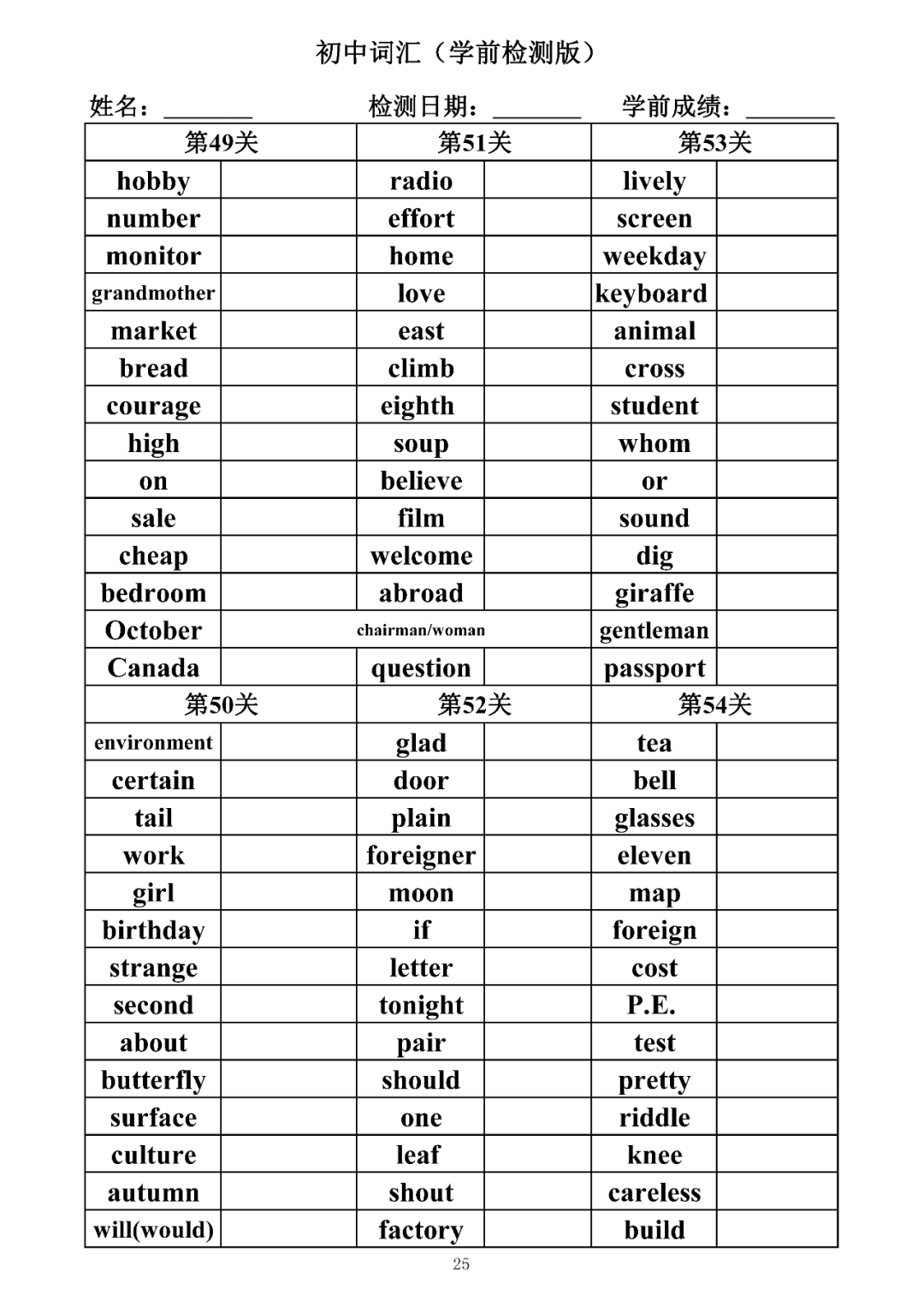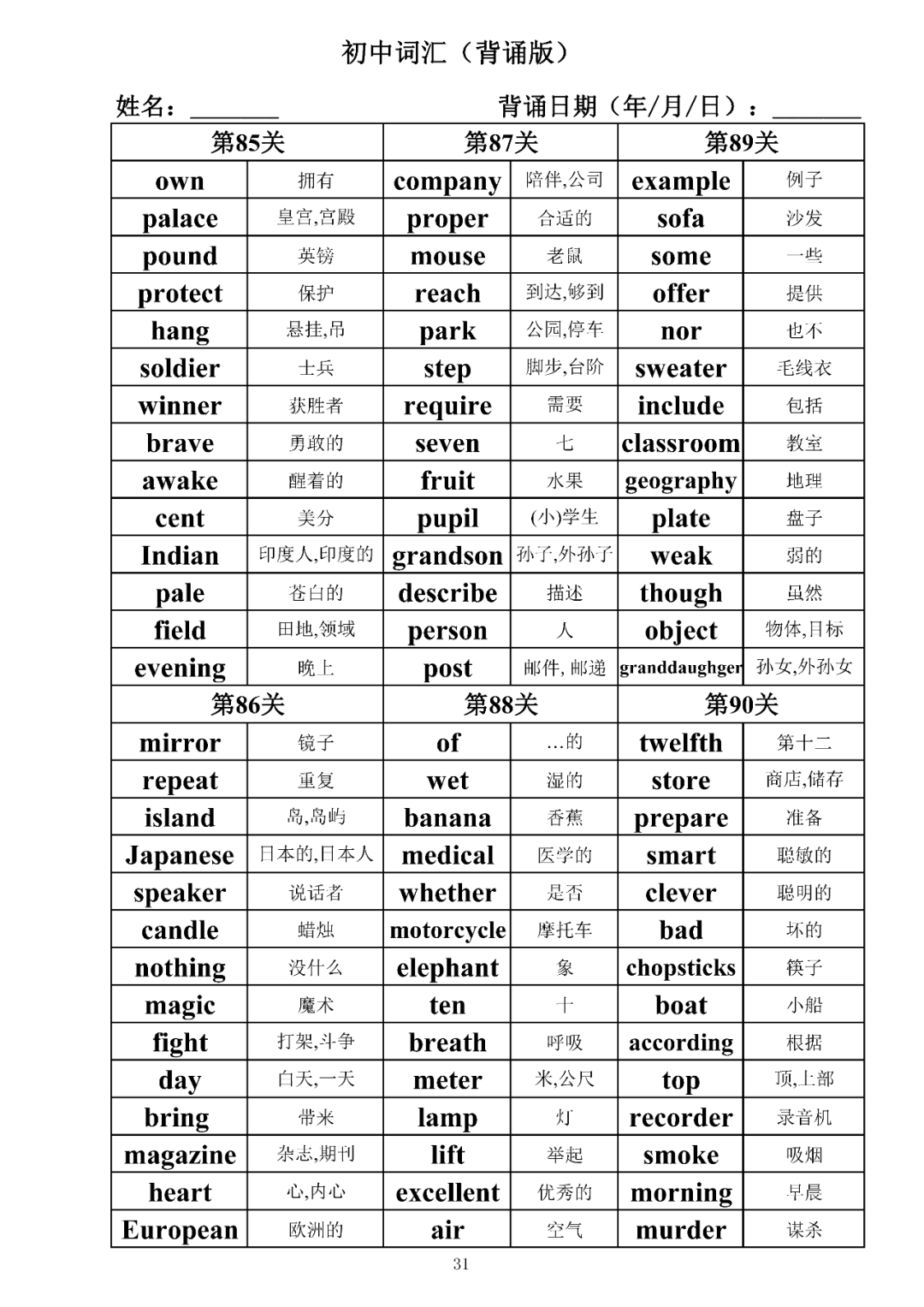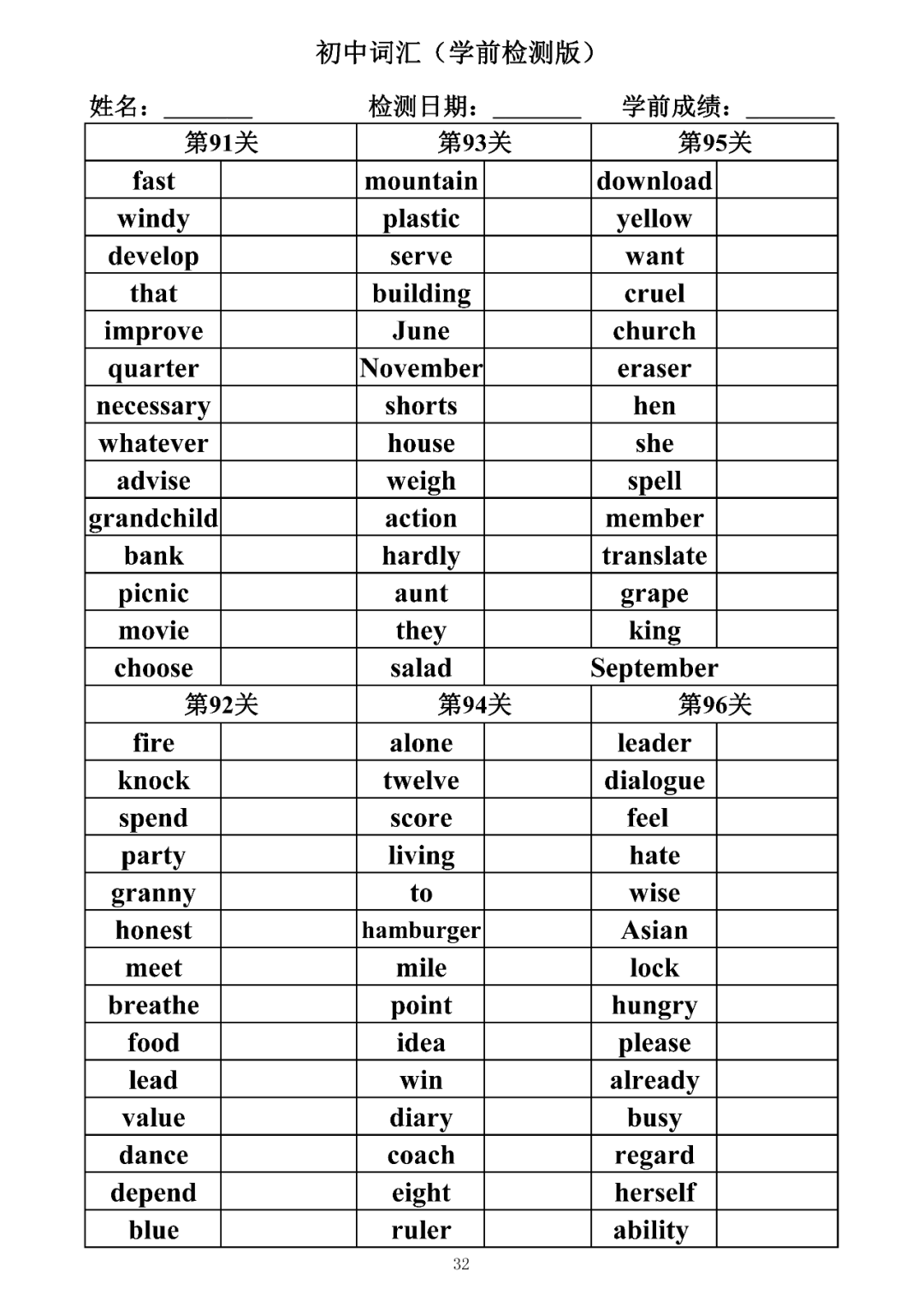 词汇是语言的基本材料,是语言的三大要素之一,掌握好词汇是学好英语的重要基石。离开词汇,语言就失去了实际意义。由此可见,词汇教学在语言教学中占有重要的地位。今天为同学们整理了初中词汇背诵版+检测版,需要的同学收藏起来学习。