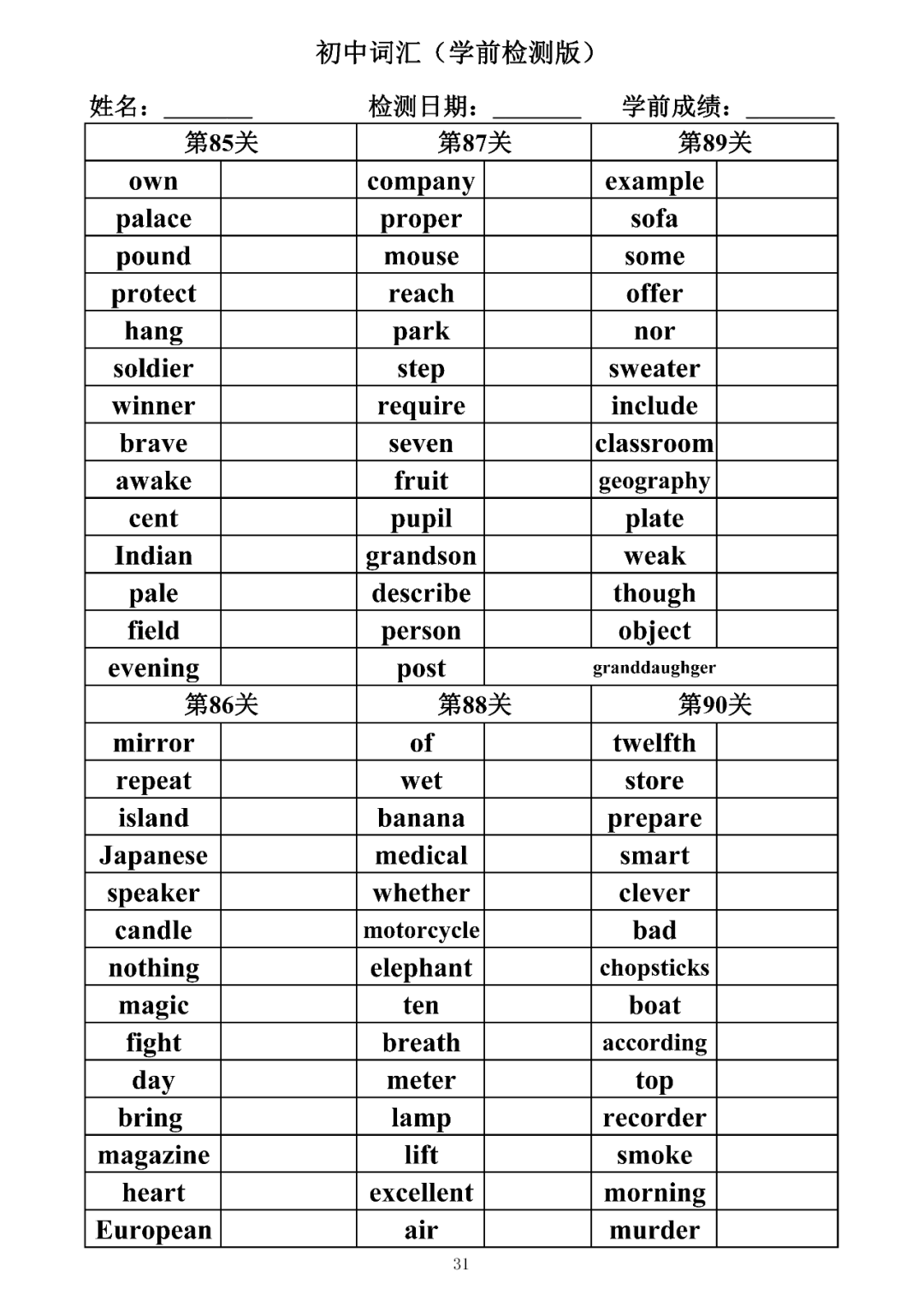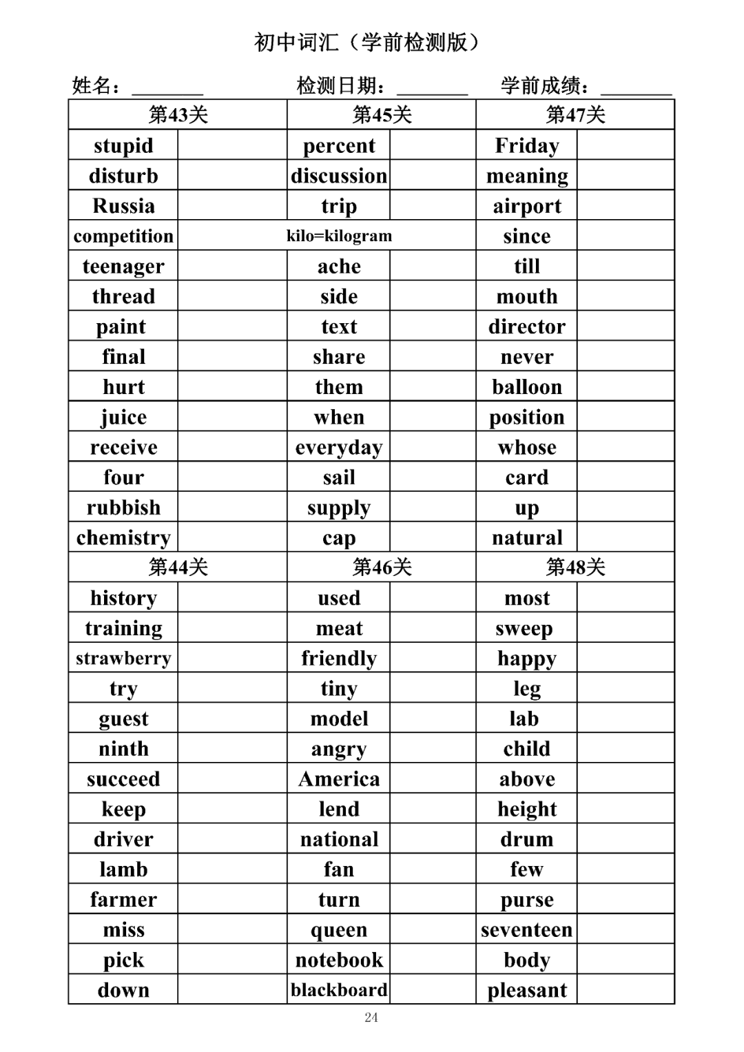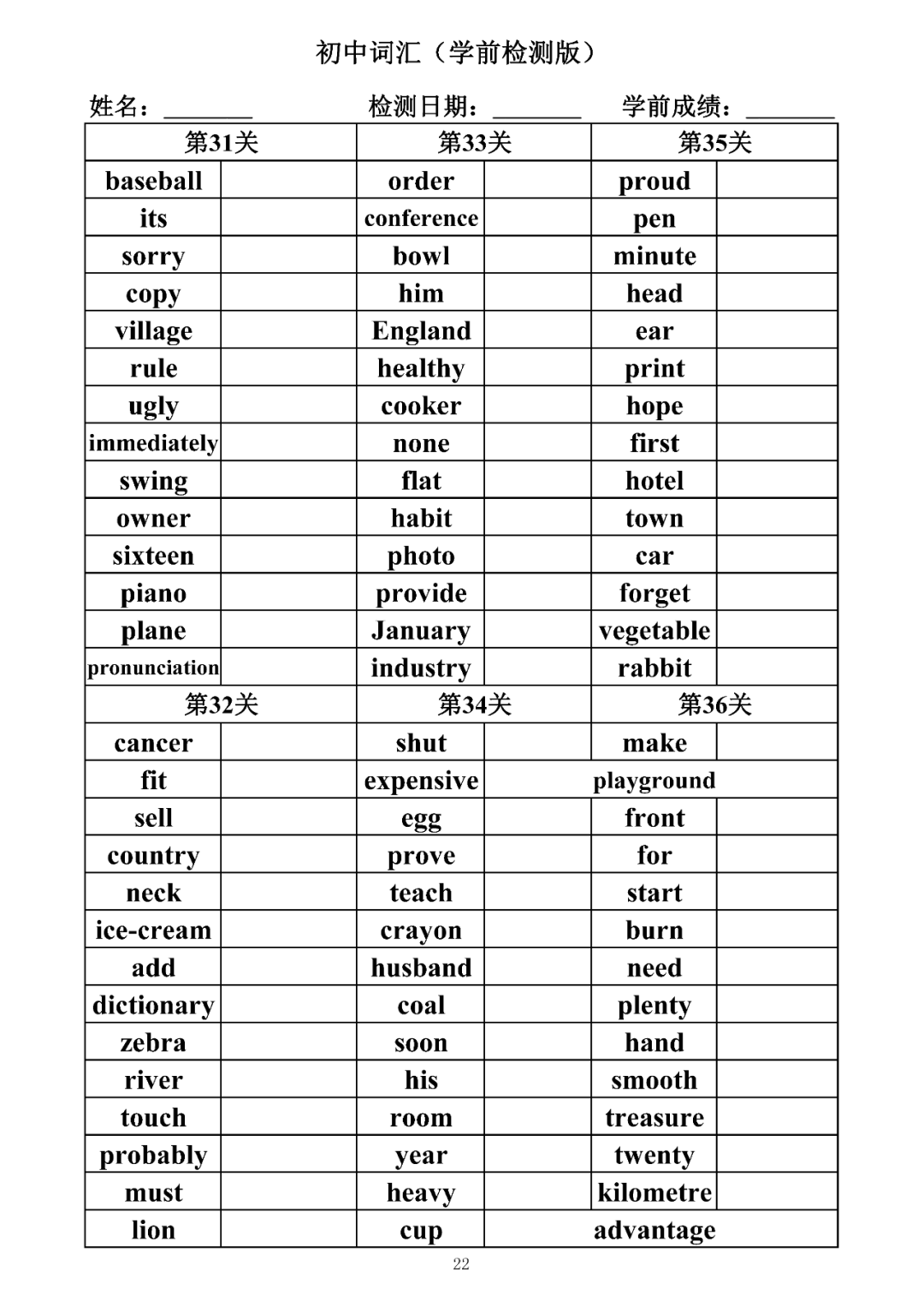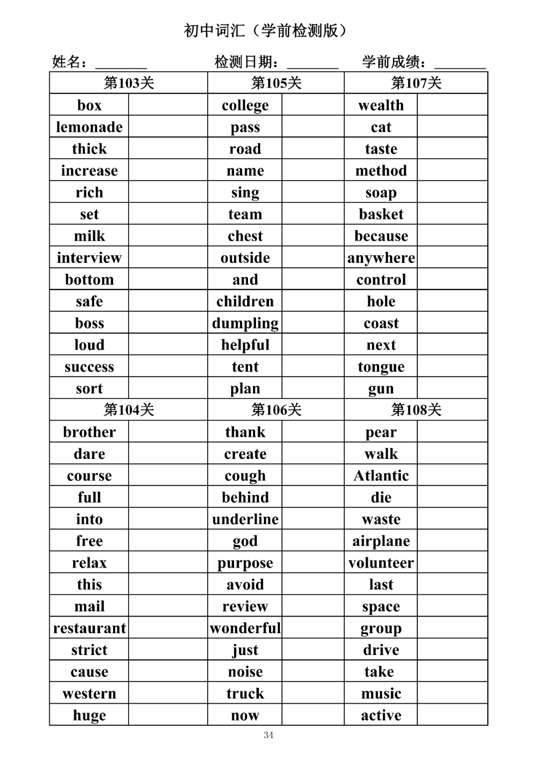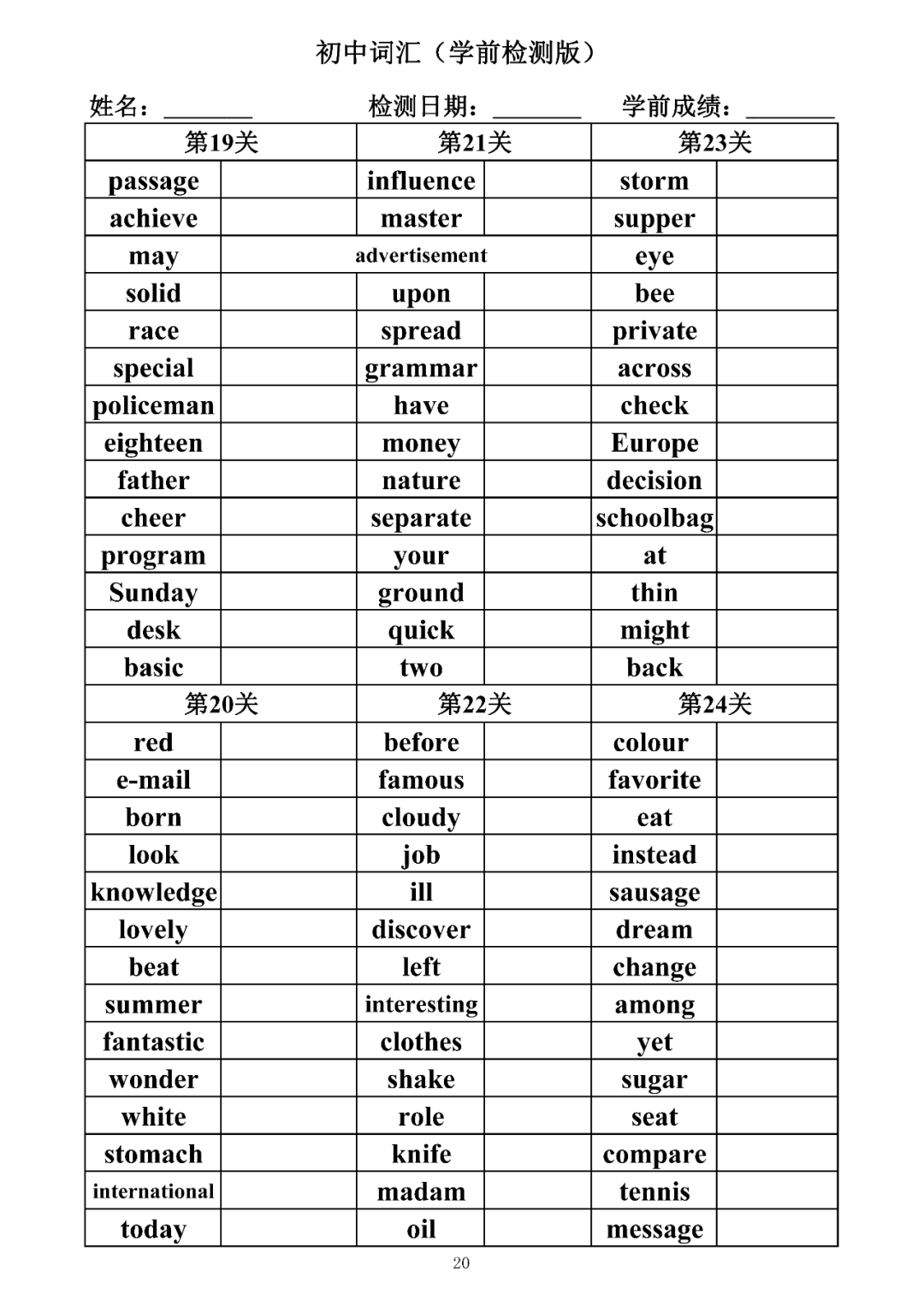 词汇是语言的基本材料,是语言的三大要素之一,掌握好词汇是学好英语的重要基石。离开词汇,语言就失去了实际意义。由此可见,词汇教学在语言教学中占有重要的地位。今天为同学们整理了初中词汇背诵版+检测版,需要的同学收藏起来学习。