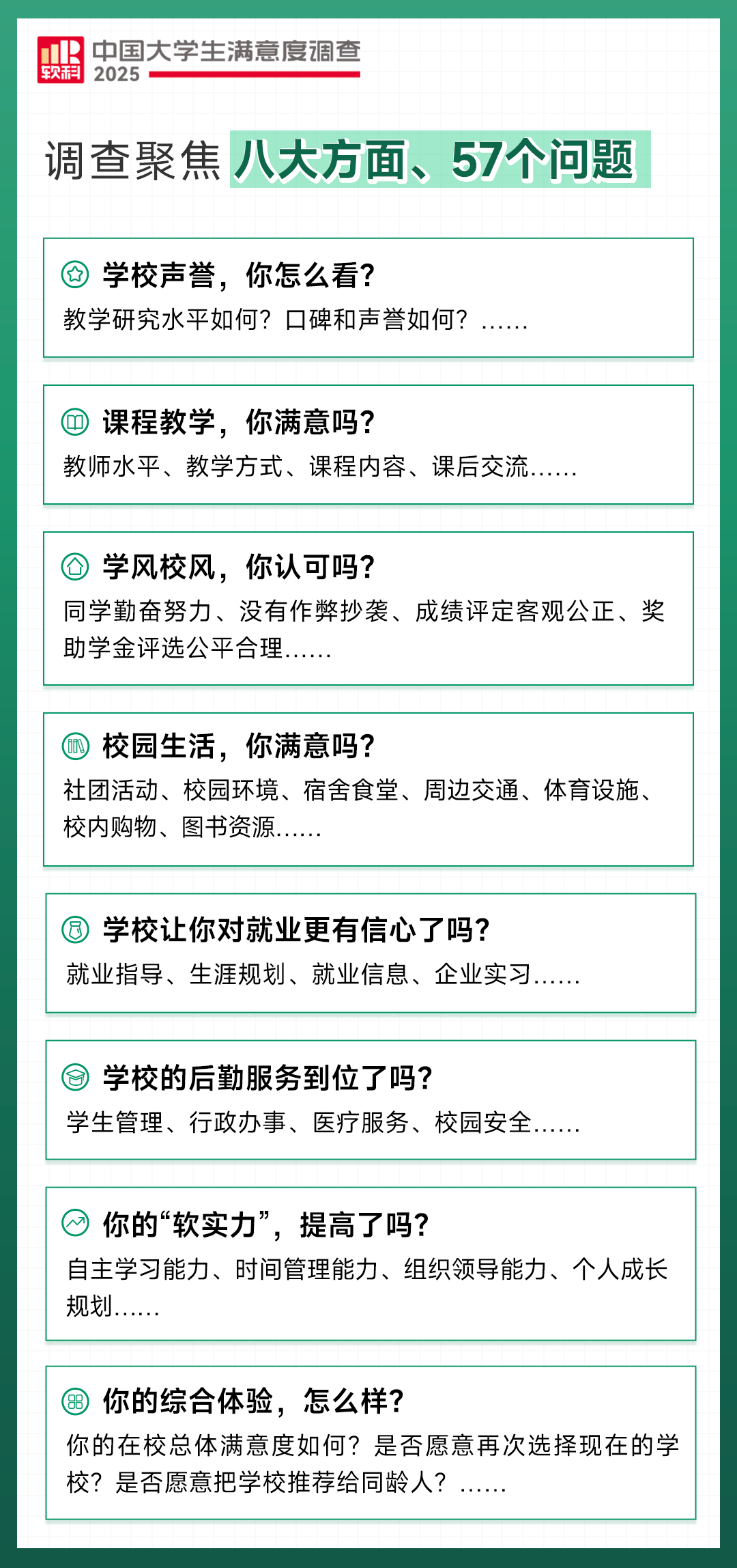 “选择什么样的大学?”这是千万考生和家长*关切的问题。软科中国大学生满意度调查聚焦学校声誉、课程教学、学风校风、校园生活、就业支持、后勤服务、成长感知、综合体验八大方面,设置了与大学学习生活密切相关的57个问题,希望从大学生的选择中找到答案。