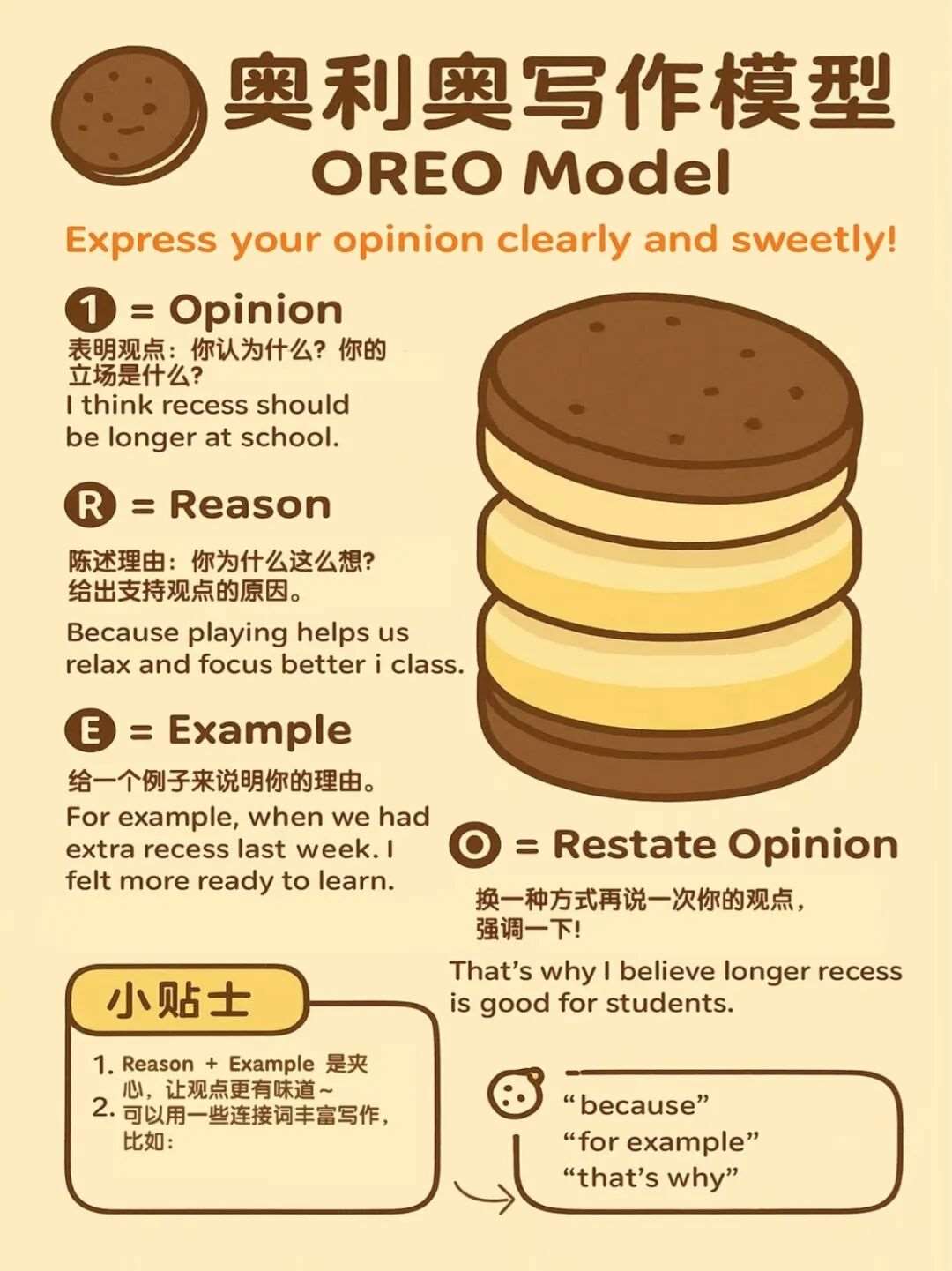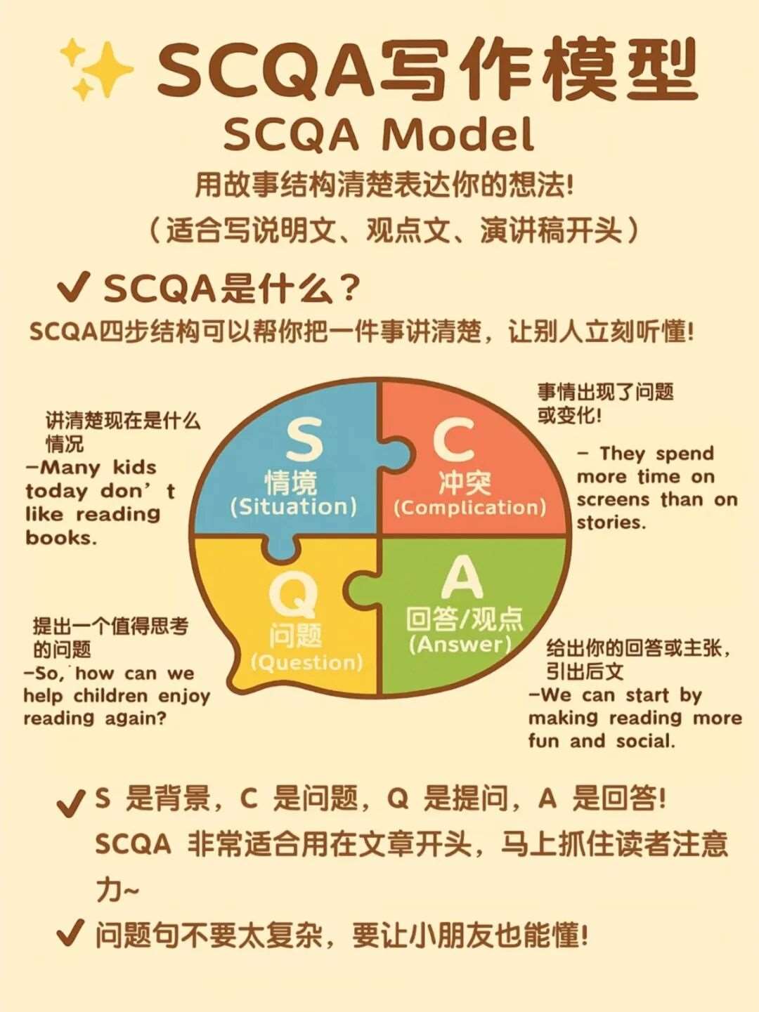 • 固定框架:书信(开头问候+正文事由+结尾祝福)、议论文(总观点+2个论据+总结)、记叙文(时间+地点+事件+感受),让孩子背熟3类文体的模板;