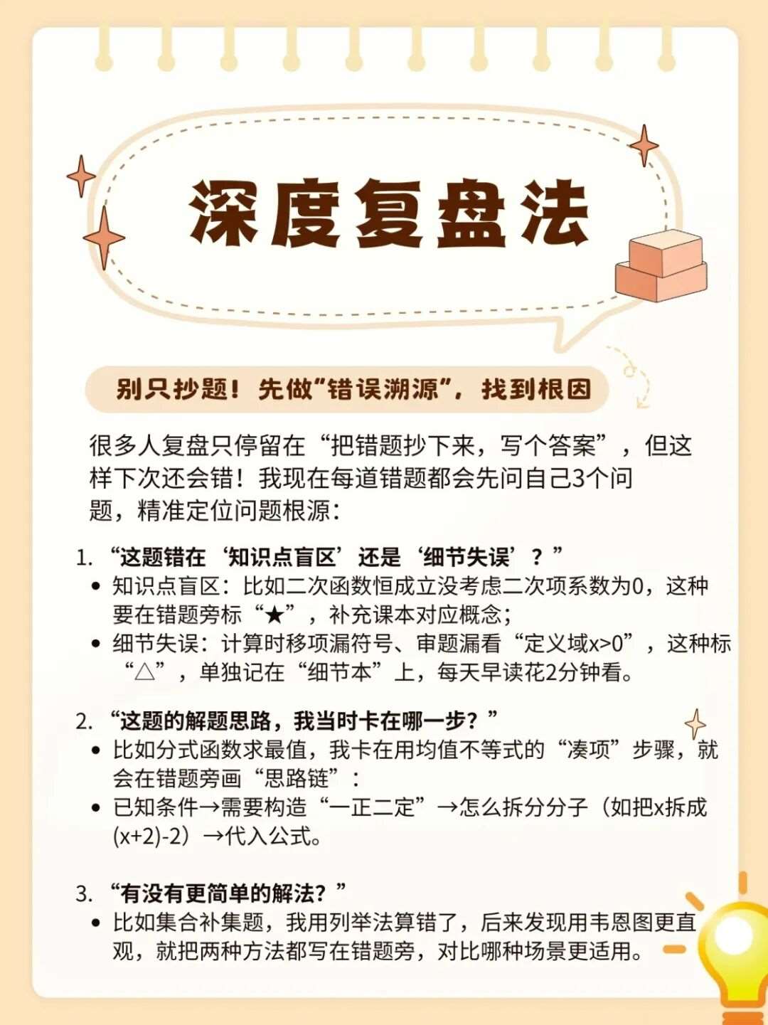 数据只是表象,真正的复盘要找到“为什么错”,把问题追溯到日常学习的具体环节,避免下次重蹈覆辙。