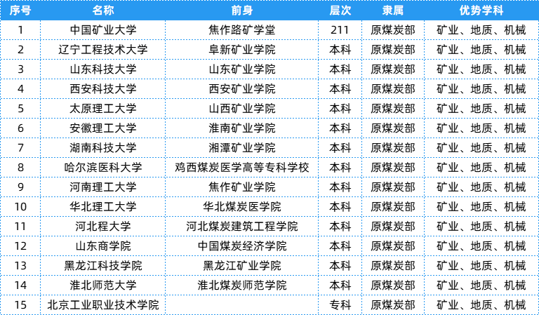 煤炭部相关院校共有15所,层次、隶属及优势等具体信息可以参考下表~