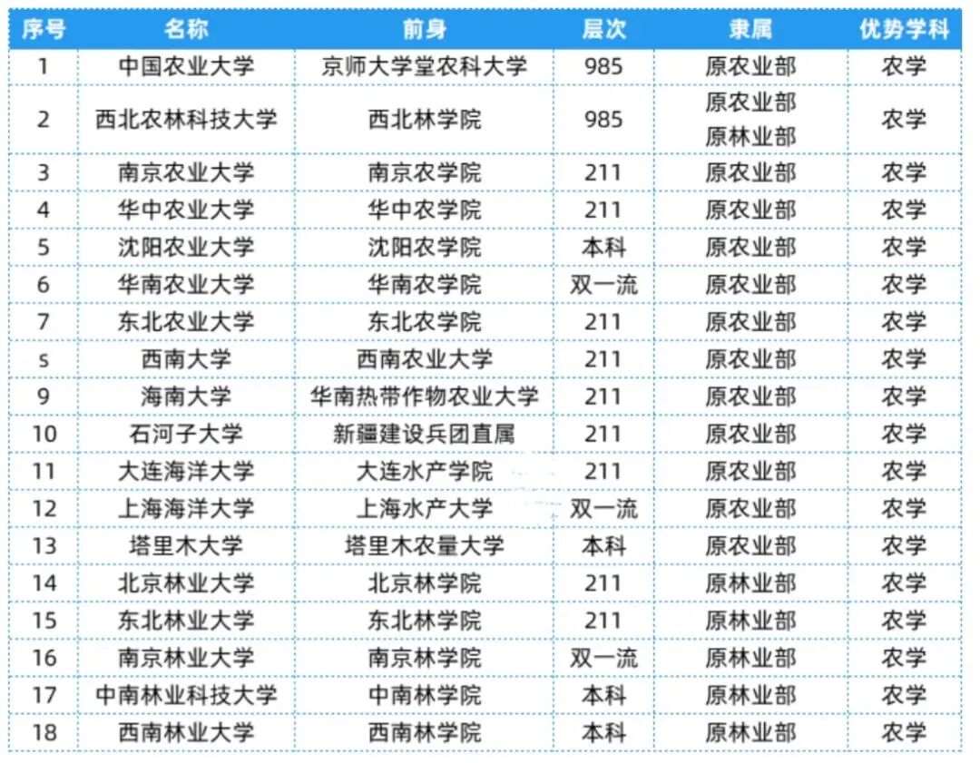 农业林业部相关院校共有18所,层次、隶属及优势等具体信息可以参考下表~