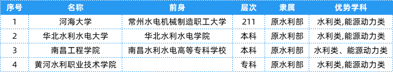 水利部相关院校共有4所,层次、隶属及优势等具体信息可以参考下表~