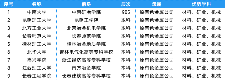 有色金属公司相关院校共有9所,层次、隶属及优势等具体信息可以参考下表