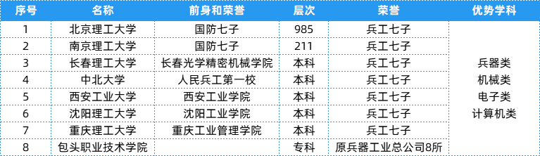 兵器工业总公司相关院校共有8所,层次、隶属及优势等具体信息可以参考下表~
