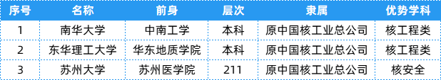 中国核工业总公司相关院校共有3所,层次、隶属及优势等具体信息可以参考下表~