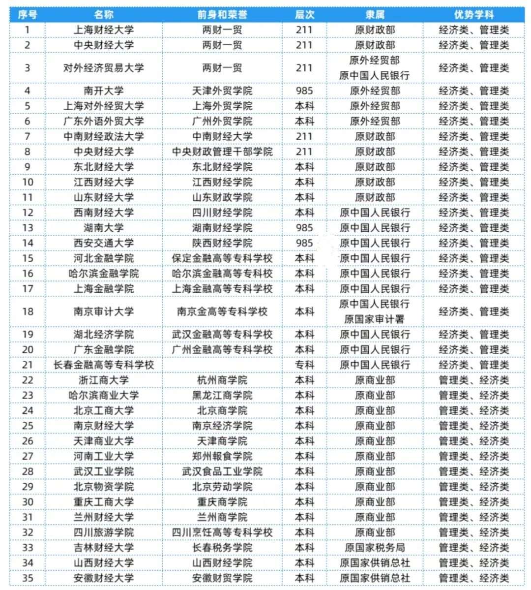 经济管理类相关院校共有35所,层次、隶属及优势等具体信息可以参考下表~