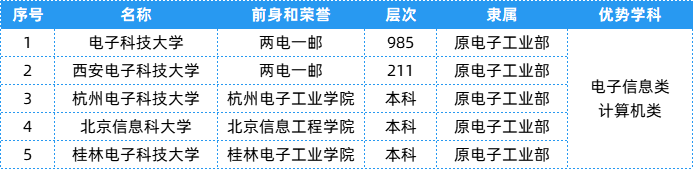 电子工业部相关院校共有5所,层次、隶属及优势等具体信息可以参考下表~