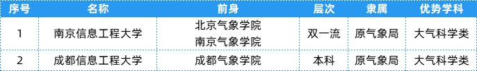 气象局相关院校共有2所,层次、隶属及优势等具体信息可以参考下表~