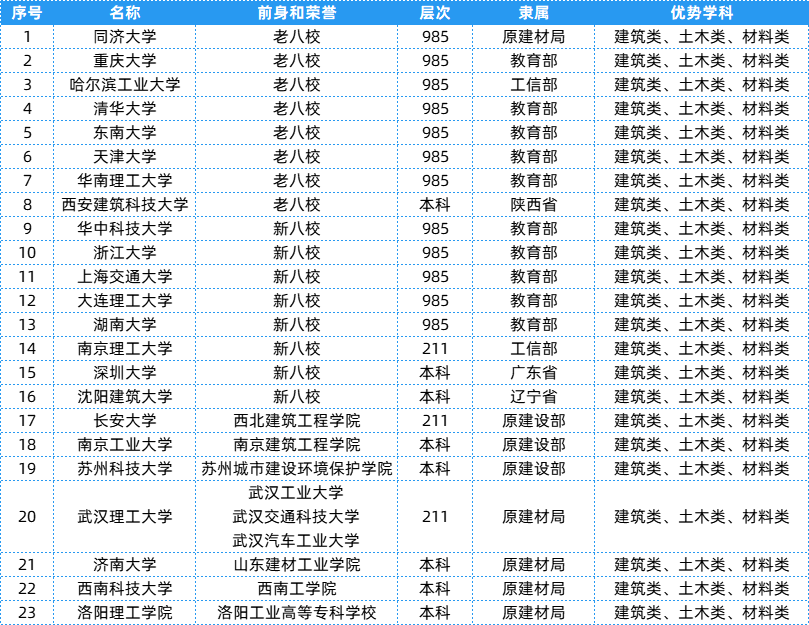 建筑类相关院校共有23所,层次、隶属及优势等具体信息可以参考下表~