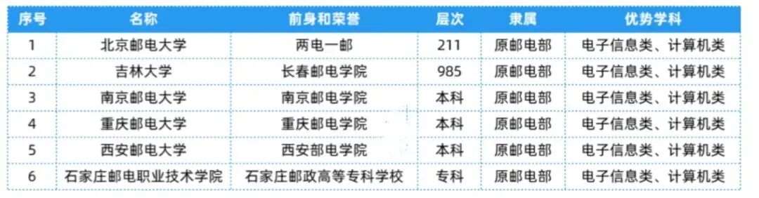 邮电部相关院校共有6所,层次、隶属及优势等具体信息可以参考下表~
