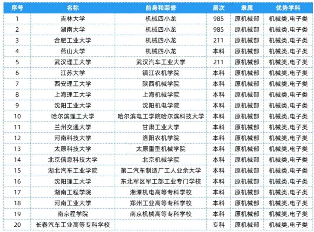 机械部相关院校共有20所,层次、隶属及优势等具体信息可以参考下表~