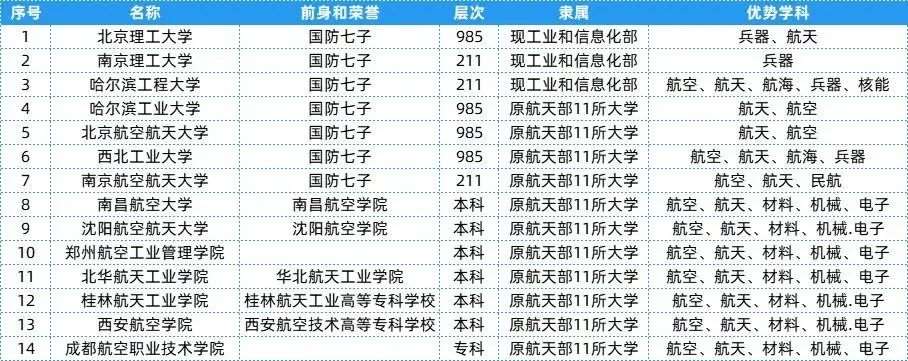 航天航空类特色院校共有14所,层次、隶属及优势等具体信息可以参考下表~