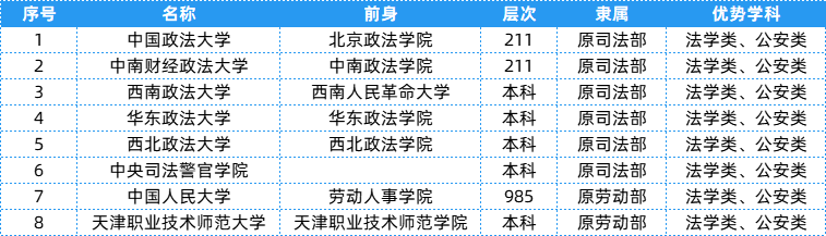 司法类相关院校共有9所,层次、隶属及优势等具体信息可以参考下表~