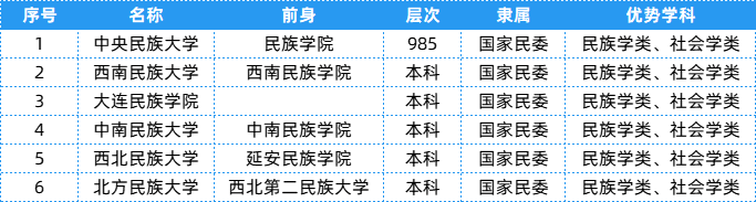 国家民委下属院校共有6所,层次、隶属及优势等具体信息可以参考下表~