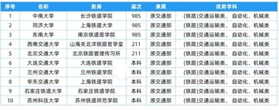 铁道部相关院校共有10所,层次、隶属及优势等具体信息可以参考下表~