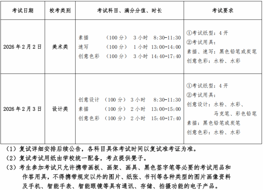 4.学校根据教育部有关规定,分别按不超过校考美术类、设计类包含专业招生计划数的4倍按类别发放校考合格证。末位考生校考*总分相同时,美术类依次比较考生素描、创意色彩、速写单科*作为排序依据;设计类依次比较考生创意设计、素描、创意色彩单科*作为排序依据。专业校考复试单科*不及格(未达60分),视为校考不合格。