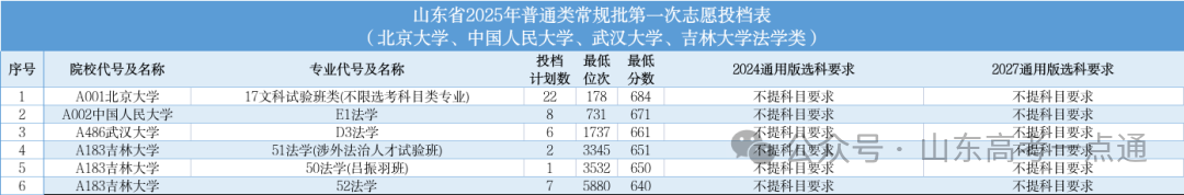 我们再来看一下北京大学、中国人民大学、武汉大学和吉林大学法学类相关专业的投档情况。在山东省2025年普通类常规批第一次志愿投档表中,我们可以看到,中国人民大学法学*低位次731位次,*低分数671分。武汉大学法学*低位次1737位次,*低分数661分。吉林大学法学(涉外法治人才试验班)*低位次3345位次,*低分数651分;法学(吕振羽班)*低位次3532位次,*低分数650分;法学*低位次5880位次,*低分数640分。其中,需要注意的是,北京大学在山东未单独设置法学专业招生,法学专业通常作为文科试验班类(含中国语言文学、法学等方向)的一部分招生,不单独公布分数线。