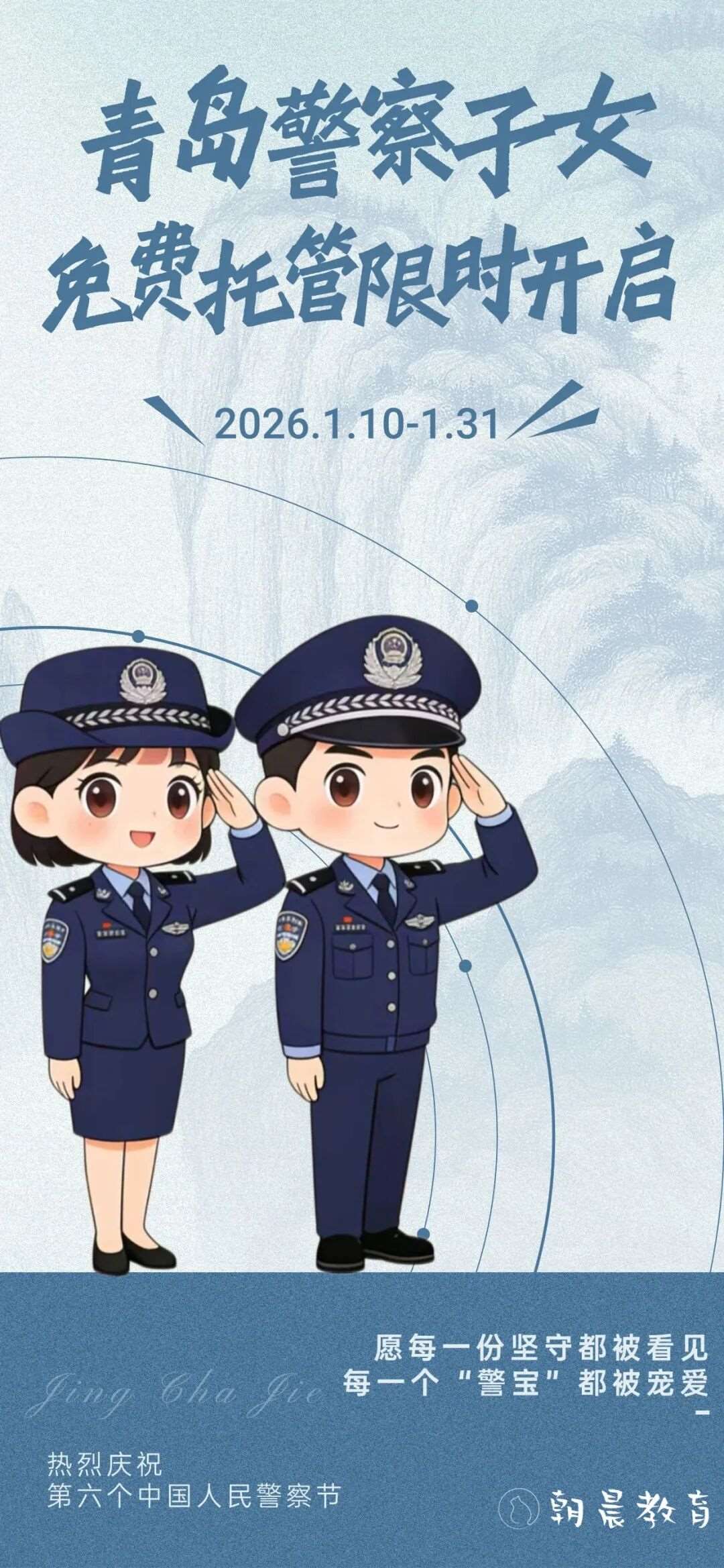 1 月 10 日,第六个中国人民警察节即将到来。朝晨教育特启动 “警宝安心家” 关爱活动,以免费托管服务,为青岛公安民警、辅警家庭筑牢 “后方防线”,让你们的守护无后顾之忧!